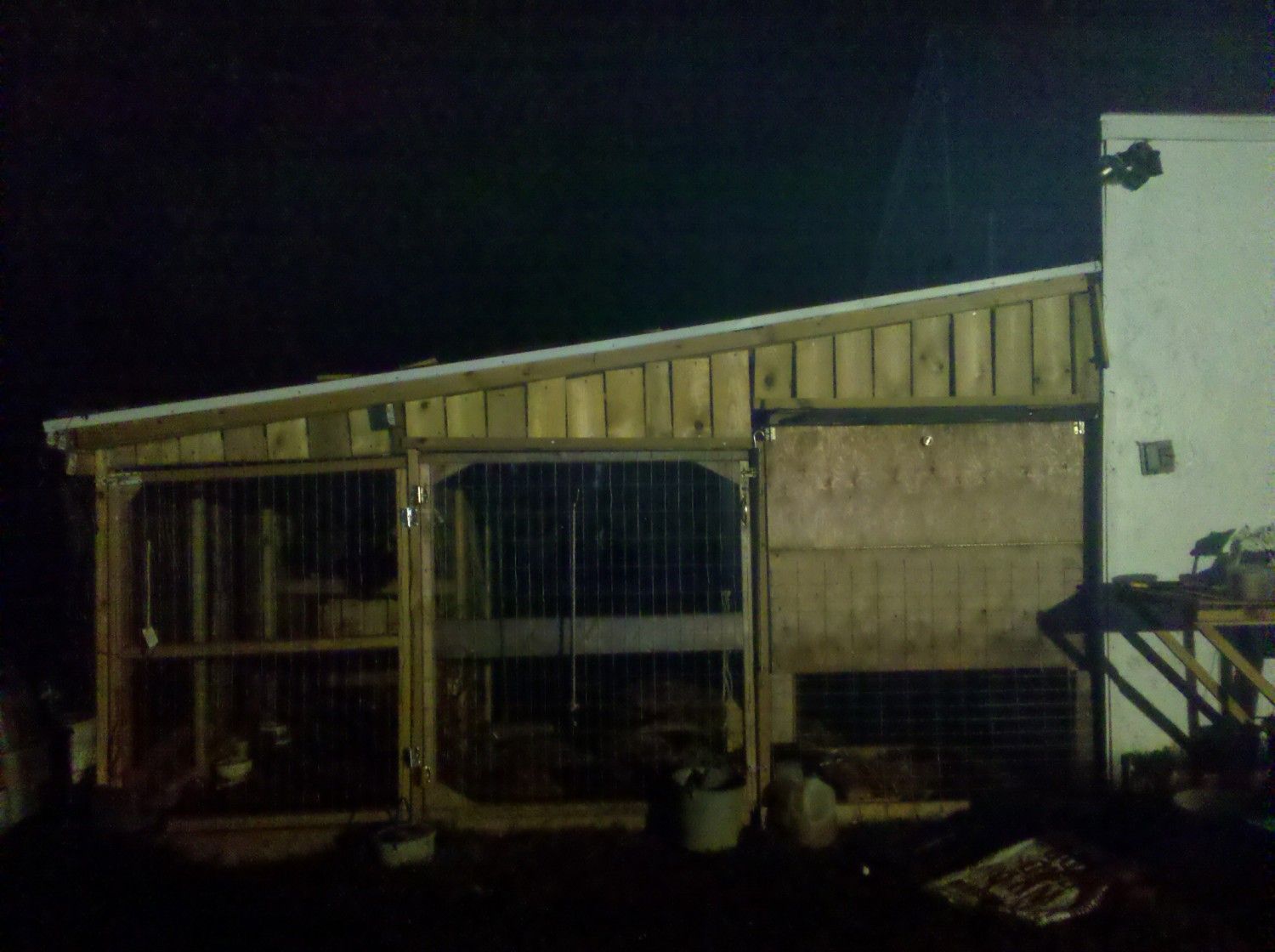 old coop/ nesting house is on the right , Middlle door is the big girls coop / run , Left door is the babies ( 4 months ) coop / run