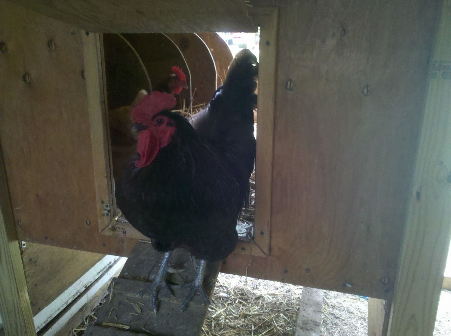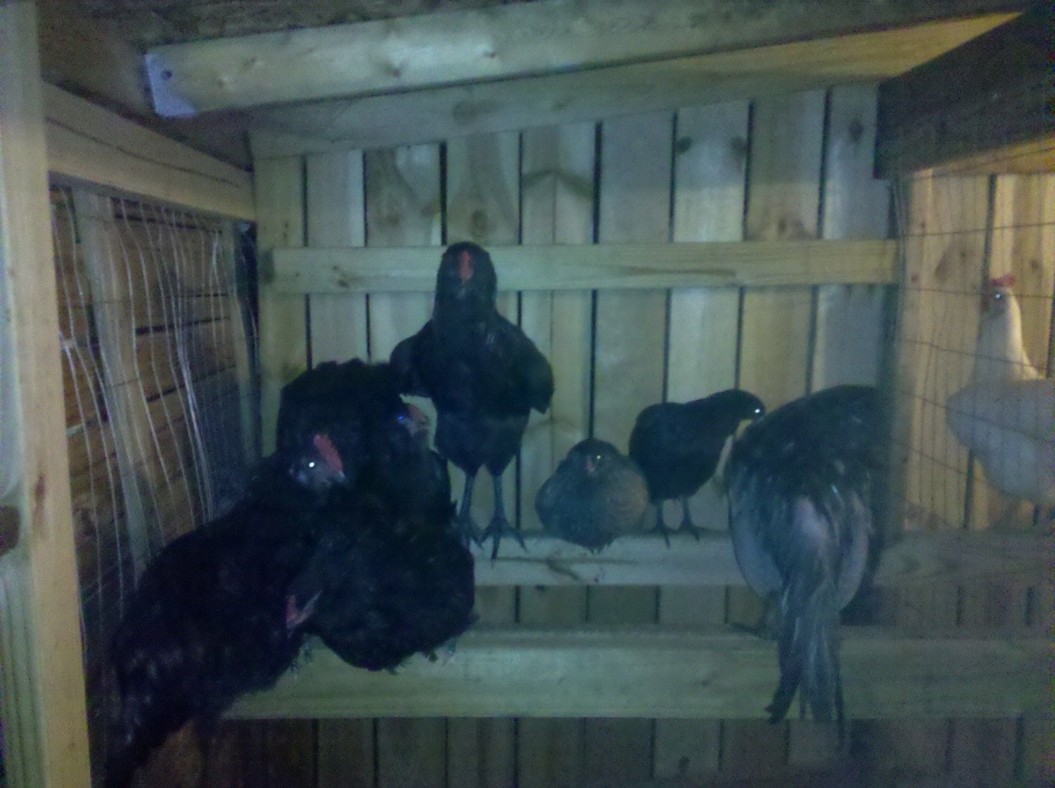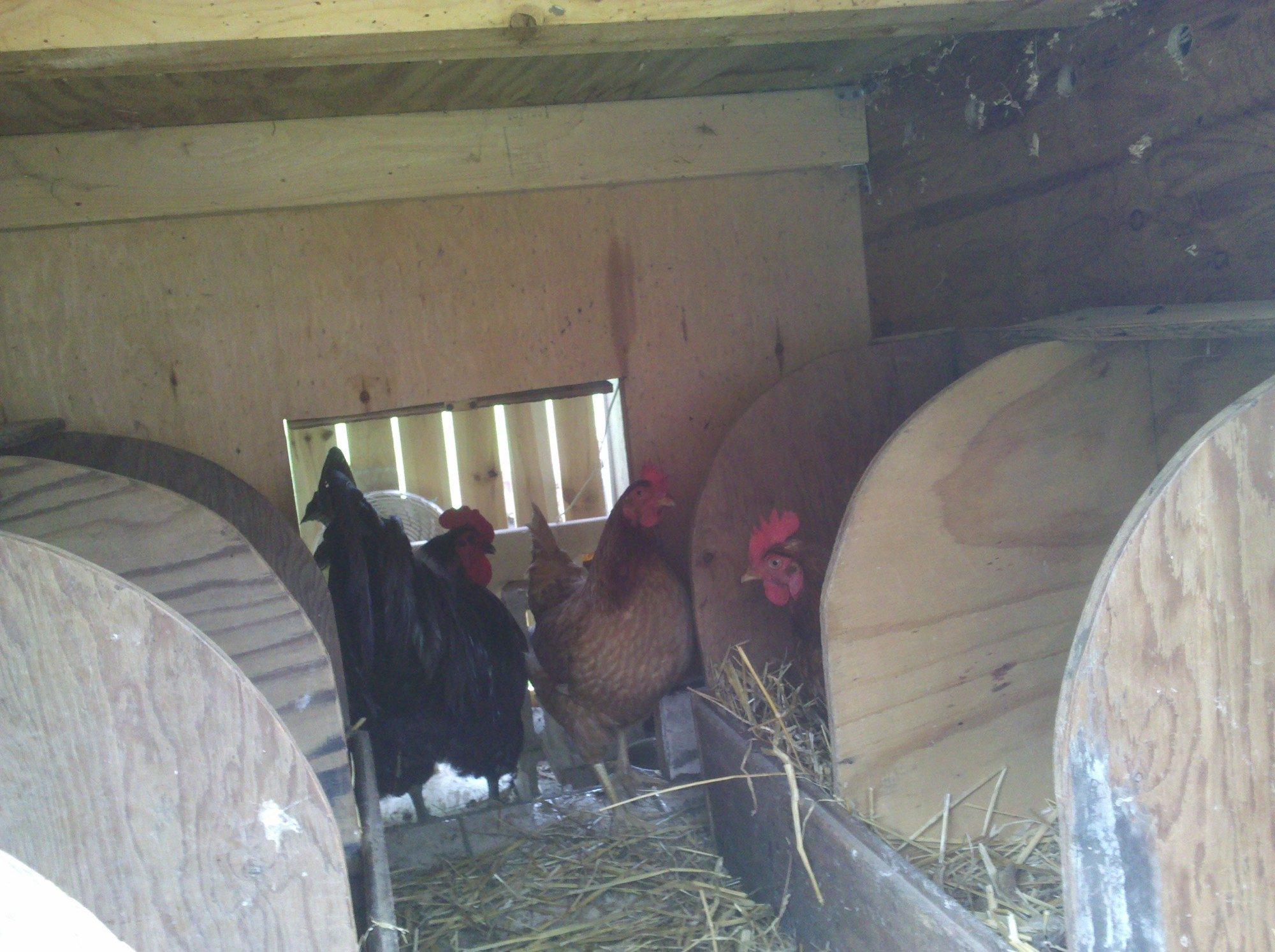 inside the henhouse....Lucky trying to teach the girls to go broody ..see the ramp..about 3 foot off the ground