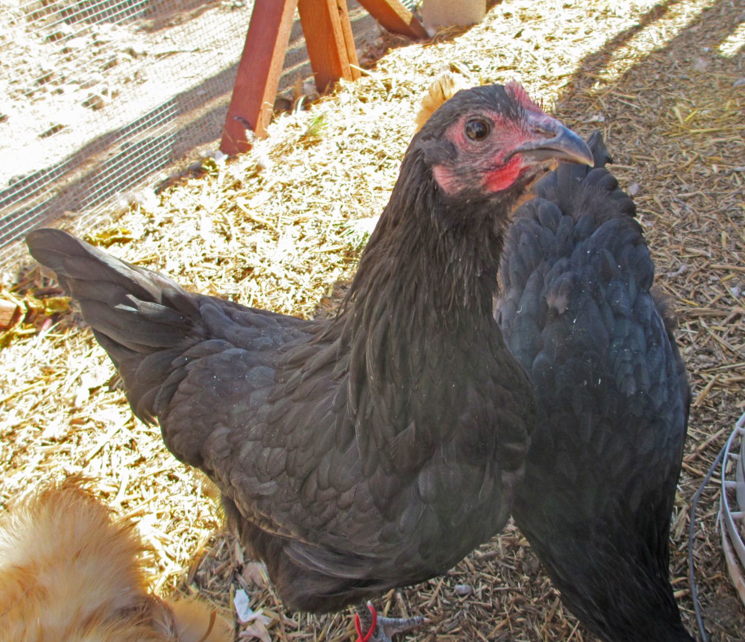 She's so pretty!All of a sudden one of my Aussie hybrids is getting very red in the face while her sisters remain pale. With her physical changes there appears to be a change occurring in their pecking order as well as in her behaviors. She's suddenly much more friendly with me and much more assertive with the rest of the flock. And her feathers are FINALLY beginning to get that lovely green iridescence (though it didn't show up in the photo). It's really quite fascinating to watch.