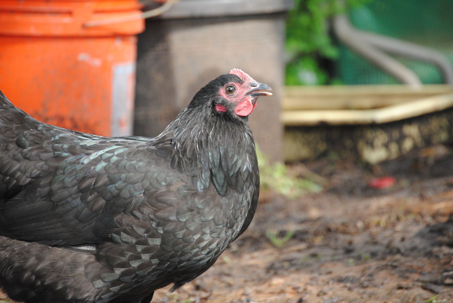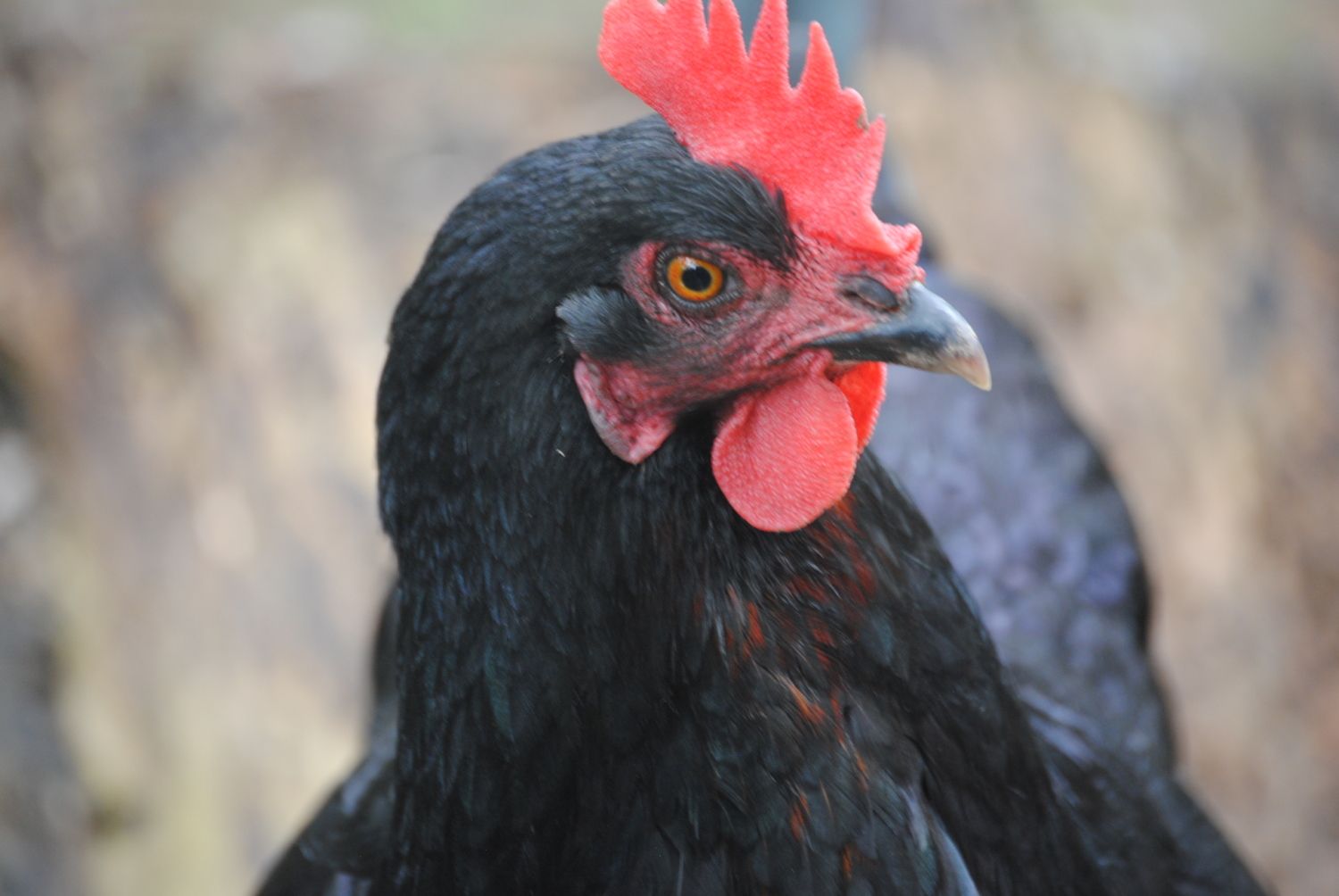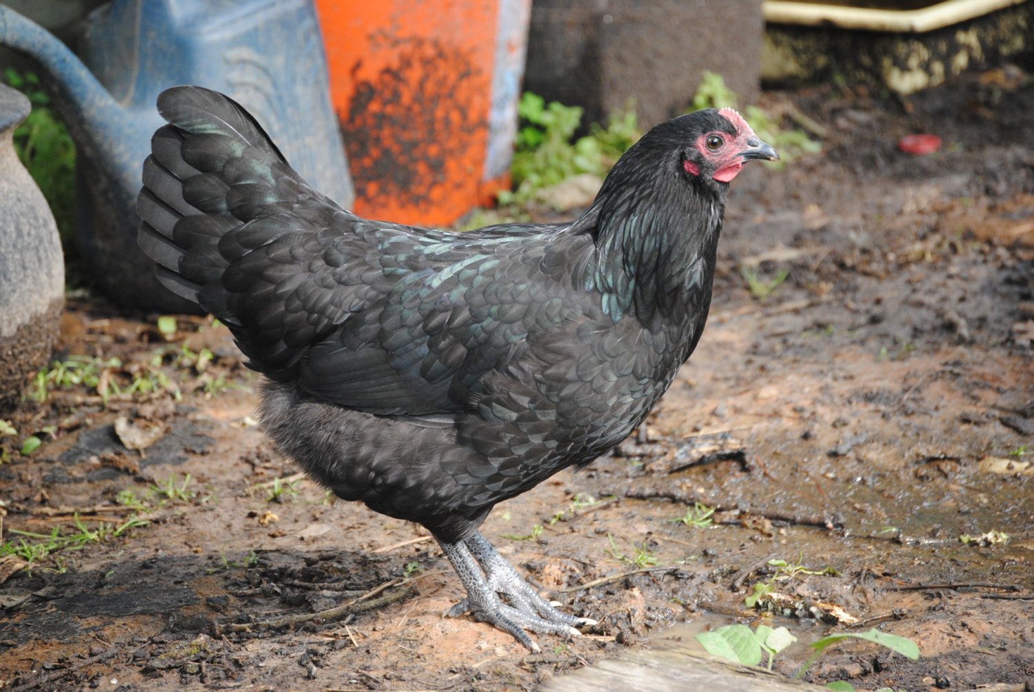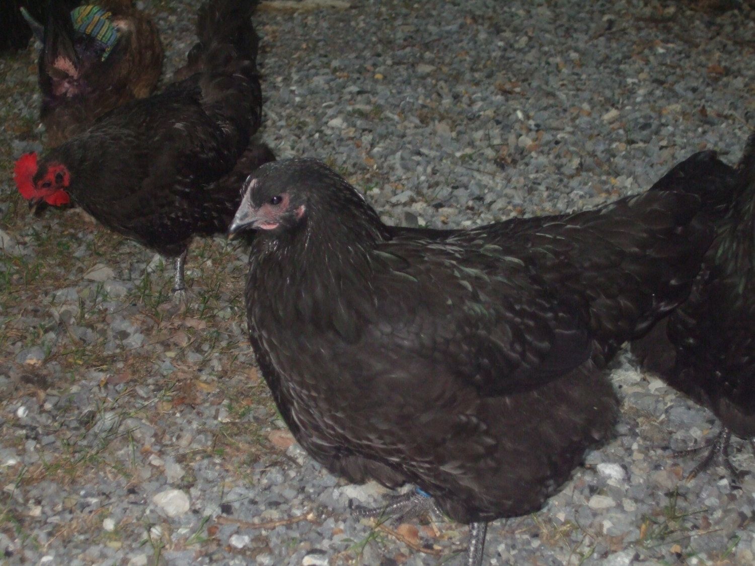 Her eyes are supposed to be almost black but dark brown is accepted, not amber as your pics show. Black Rocks, black sex links and alot of other black birds have amber eyes, but not Black Australorps.The purple sheen, red leakage and amber eye color lead me to believe something is mixed into your hen. The pullet in your pics is very nice looking. I am not trying to offend in anyway just relaying information from the American Poultry Assocs. Standard of Perfection Book in reference to Black Australorps. Below is one of my pullets and a cockerel.
