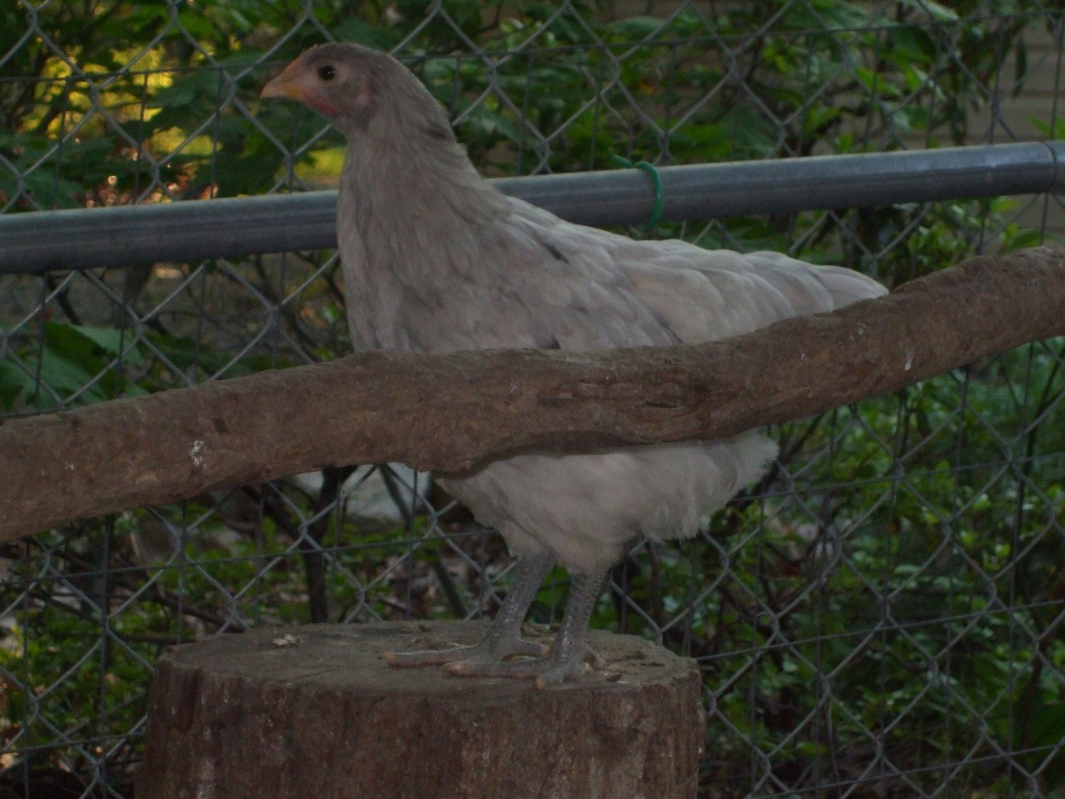 This is Spencer's hatch mate. She's a very sweet pullet, very curious. She was squatting here because I was throwing things at her to get her to look at me. Didn't happen.