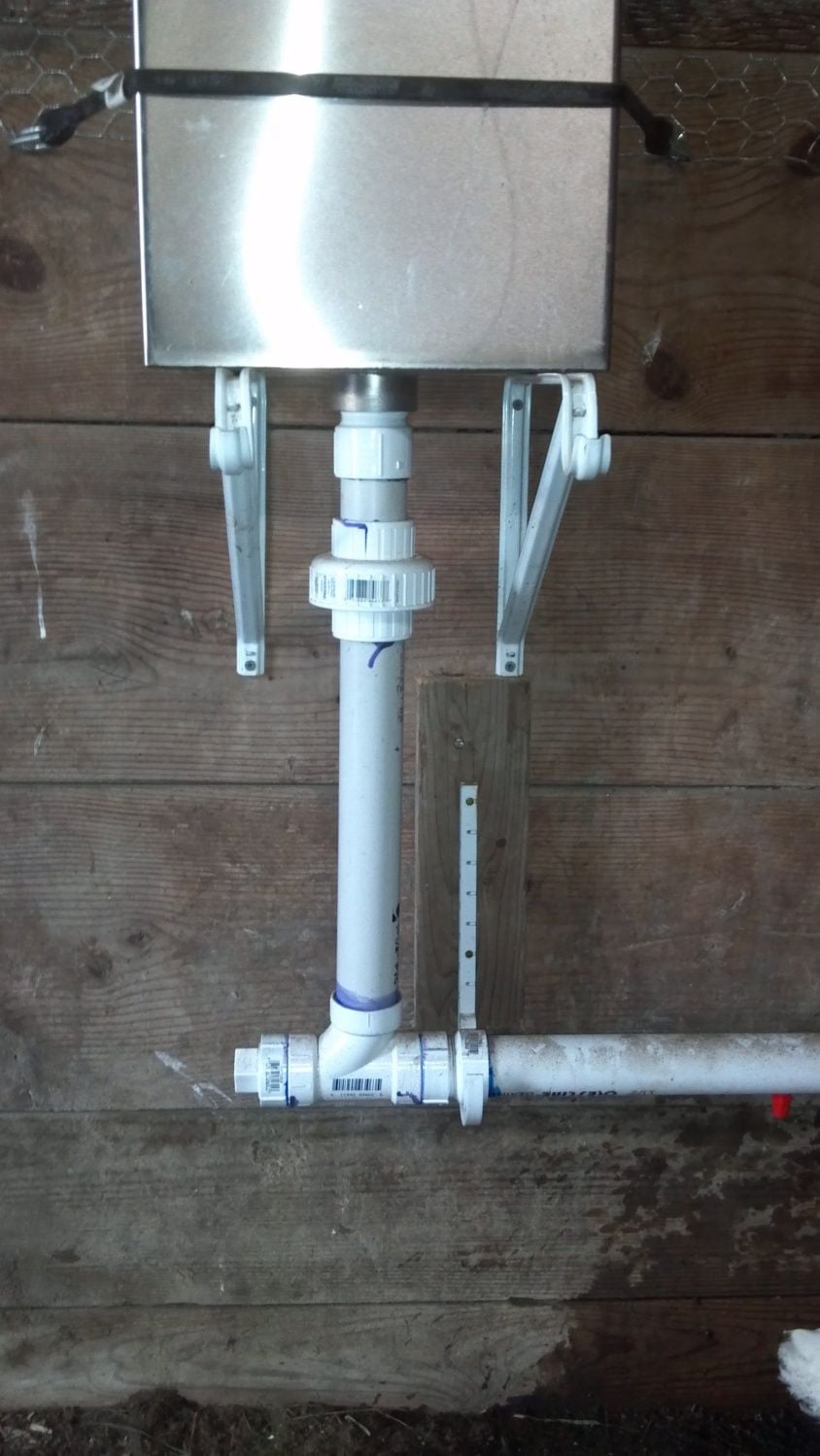 (Pretty much a toilet tank mounted to pvc with nipple waterers in it)
