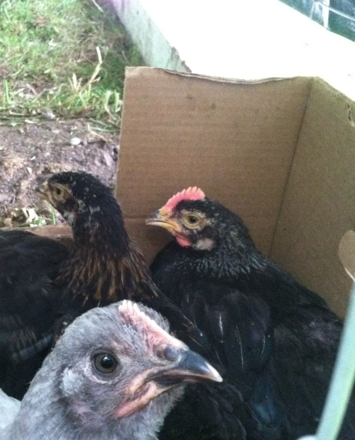 We got a batch of whites from Joe Marquette and a batch of 20 blacks and 5 SG's from Sandhill. The original intention was to get whites from Sandhill until we found out Joe was going to let some whites fly the coop Spring of 2012. We did not hesitate and ordered 40 whites from Joe. We even have a rooster at 5 weeks crowing, it's the cutest thing to see. They are very nice birds and like to be petted Thanks big time Joe!
