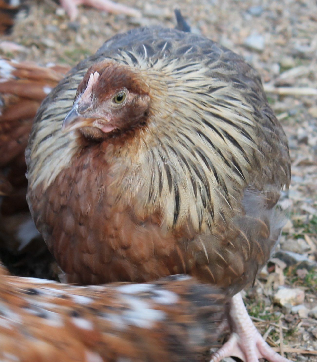 ok well, i finally got pics. i test-bred my dilute/colored girl before i lost her to a predator. i've got 2 younger chicks growing out, and one slightly older pullet... this proves to me that the dilute mutation is a dominant one, she also carries the melanizing gene which is giving her some nice hackle striping (and a few dark tips to the breast feathers). i think the charcoal gene also, which is being diluted as well, giving her a red head, but i might be off on that one, since it's supposed to moderate black pigments not red ones.