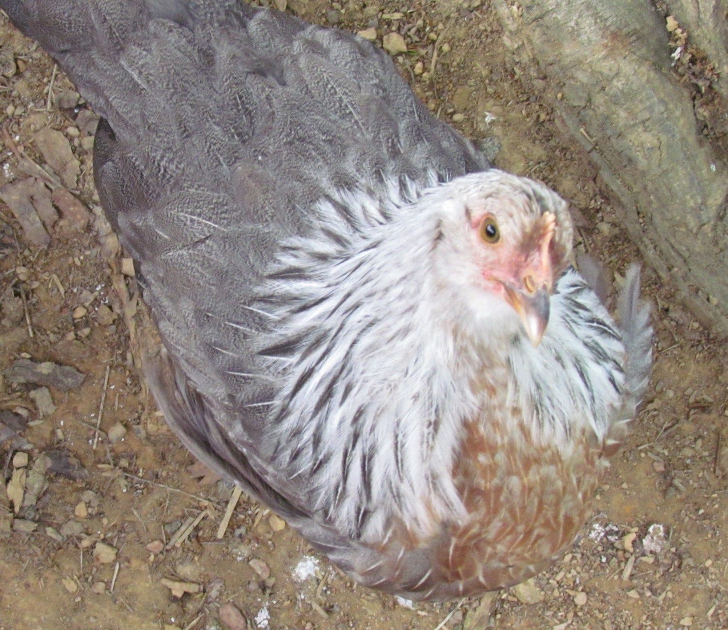 the dilute gene is also dominant, but appears the same as heterozygous or homozygous, so test breeding would need to be done to tell if it's 'split' or not. it also restricts red pigments, but not to the extent silver does. melanizing is also a dominant gene, but seems to vary in it's appearance, depending on what other mutations are present. there may also be other melanizing mutations present as well in the coloreds, possibly including charcoal. IMO the melanizing gene in dorkings intensifies the hackle striping and black tips on the breast of the hens, while the charcoal may be responsible for the black head and darkening of the body/back/wing feathers. I have one hen (i've posted her before i think) that is a standard silver grey in every way, but she has a black head. her mother was a colored from sandhill lines (possibly not pure colored but mixed with red) and her sire a silver grey. she has NO heavy hackle striping or breast tips, but does have a very black head. test breeding her to a silver grey, i'm anticipating that i'll get 50/50 black headed without any dark hackles at all.