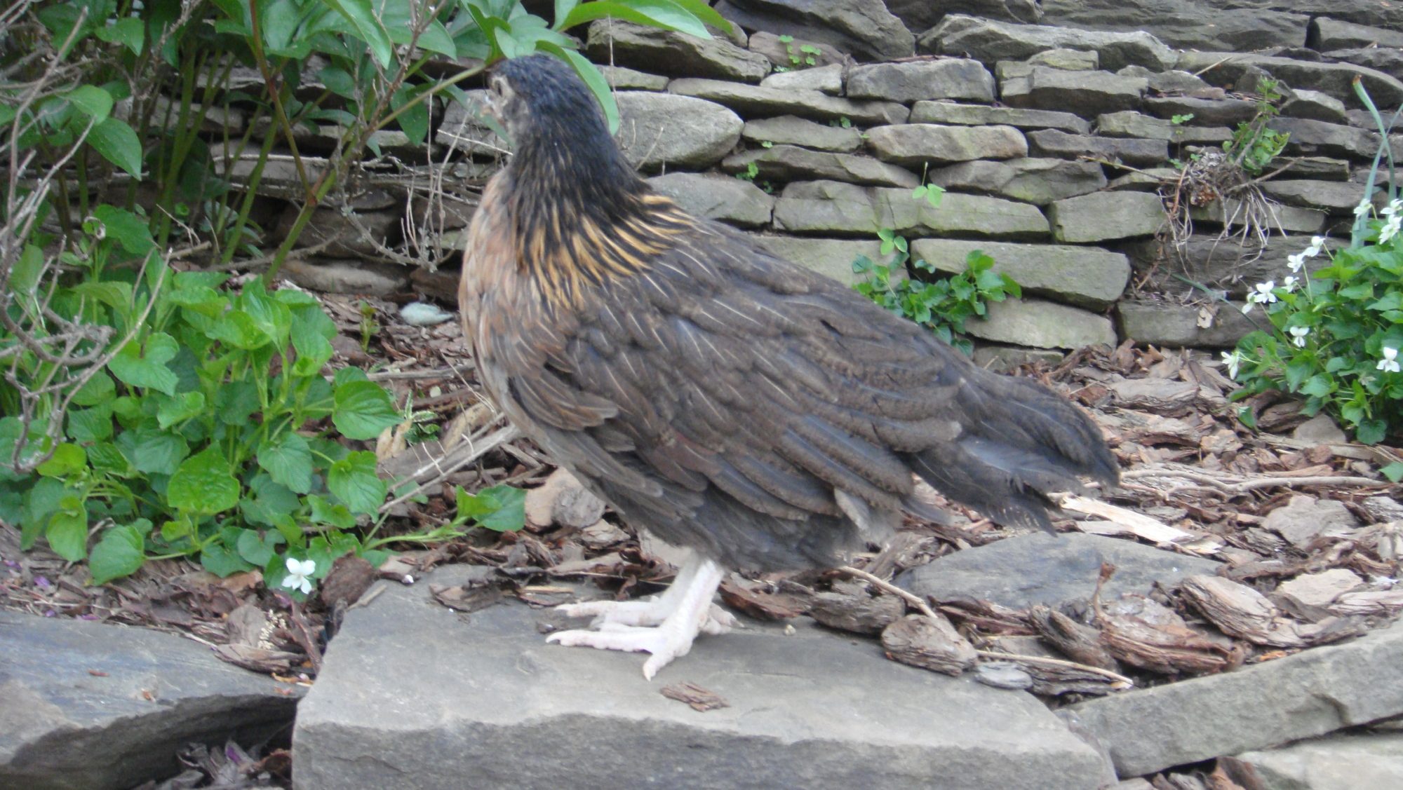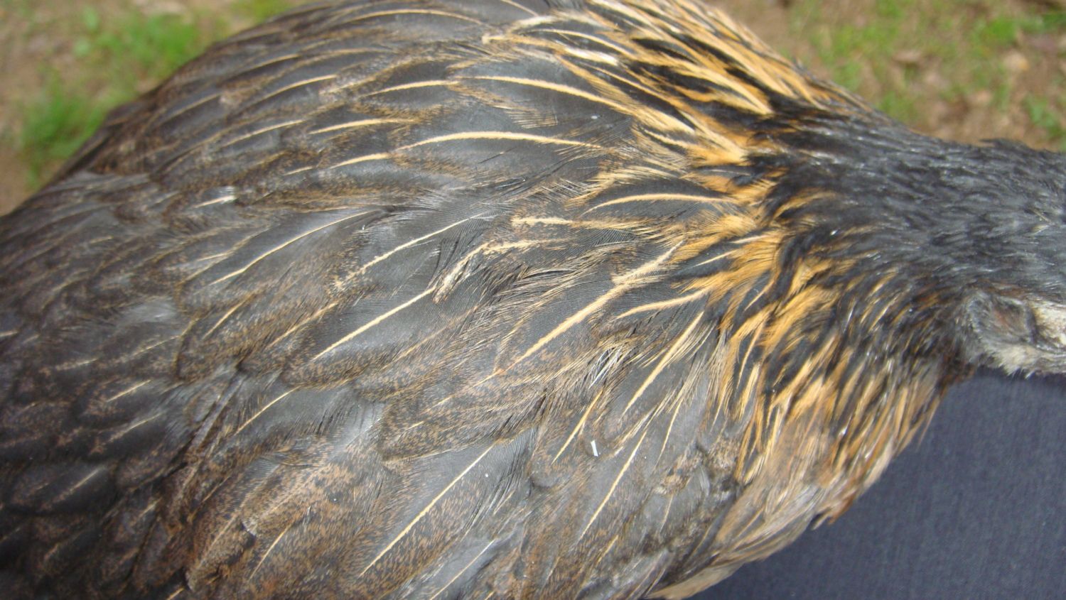 the dilute gene is also dominant, but appears the same as heterozygous or homozygous, so test breeding would need to be done to tell if it's 'split' or not. it also restricts red pigments, but not to the extent silver does. melanizing is also a dominant gene, but seems to vary in it's appearance, depending on what other mutations are present. there may also be other melanizing mutations present as well in the coloreds, possibly including charcoal. IMO the melanizing gene in dorkings intensifies the hackle striping and black tips on the breast of the hens, while the charcoal may be responsible for the black head and darkening of the body/back/wing feathers. I have one hen (i've posted her before i think) that is a standard silver grey in every way, but she has a black head. her mother was a colored from sandhill lines (possibly not pure colored but mixed with red) and her sire a silver grey. she has NO heavy hackle striping or breast tips, but does have a very black head. test breeding her to a silver grey, i'm anticipating that i'll get 50/50 black headed without any dark hackles at all.