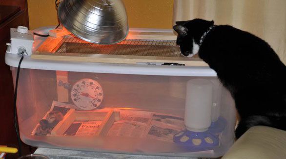 this keeps the chicks safe from our cats. I also attached a small upright too the frame too hold the lamp. I have found this works very well.