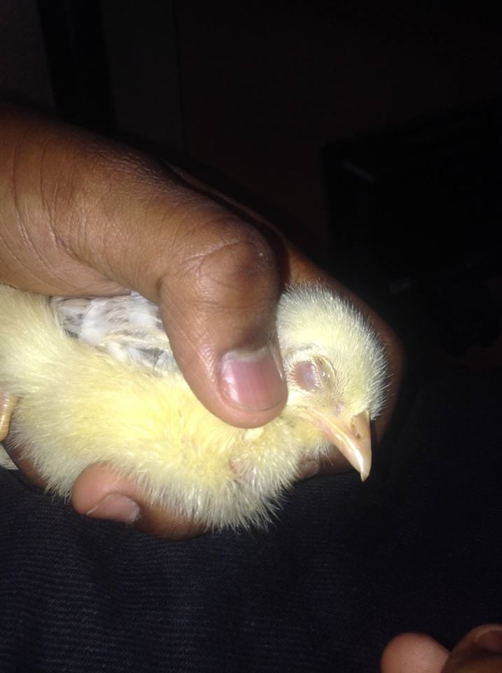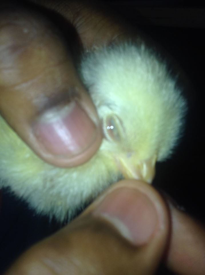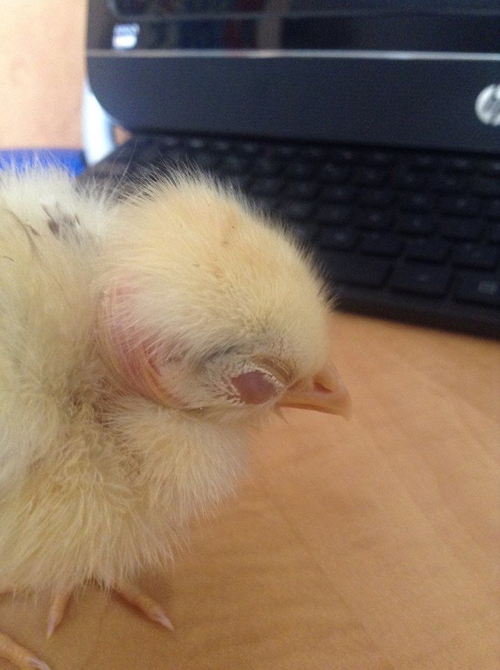 If she is just days old, it is probably from a peck to her eye. Look into it for any dirt or bedding, gently open the eye and put some saline eye drops in to wash it out. If it starts draining or she keeps it closed, get some Terramycin Eye Drops or Vetericyn Eye Gel from your feed store.Those are pricey, and I have used plain Neosporin in my chicken's eye without a problem, but those 2 products are specifically for eyes.