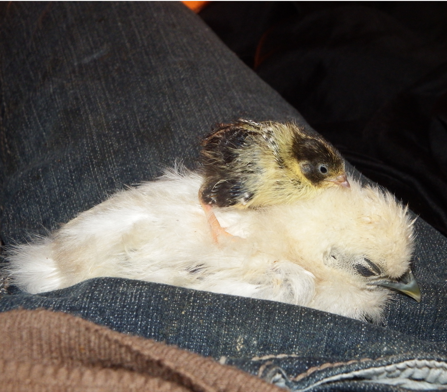 Got an adorable pic I took of my new quail chick X3 Little Bee the firstborn king quail and my firstborn silkie chicken chick, Little Peep-Peep. I don't keep them together as I know the larger chicks would harm the quail.