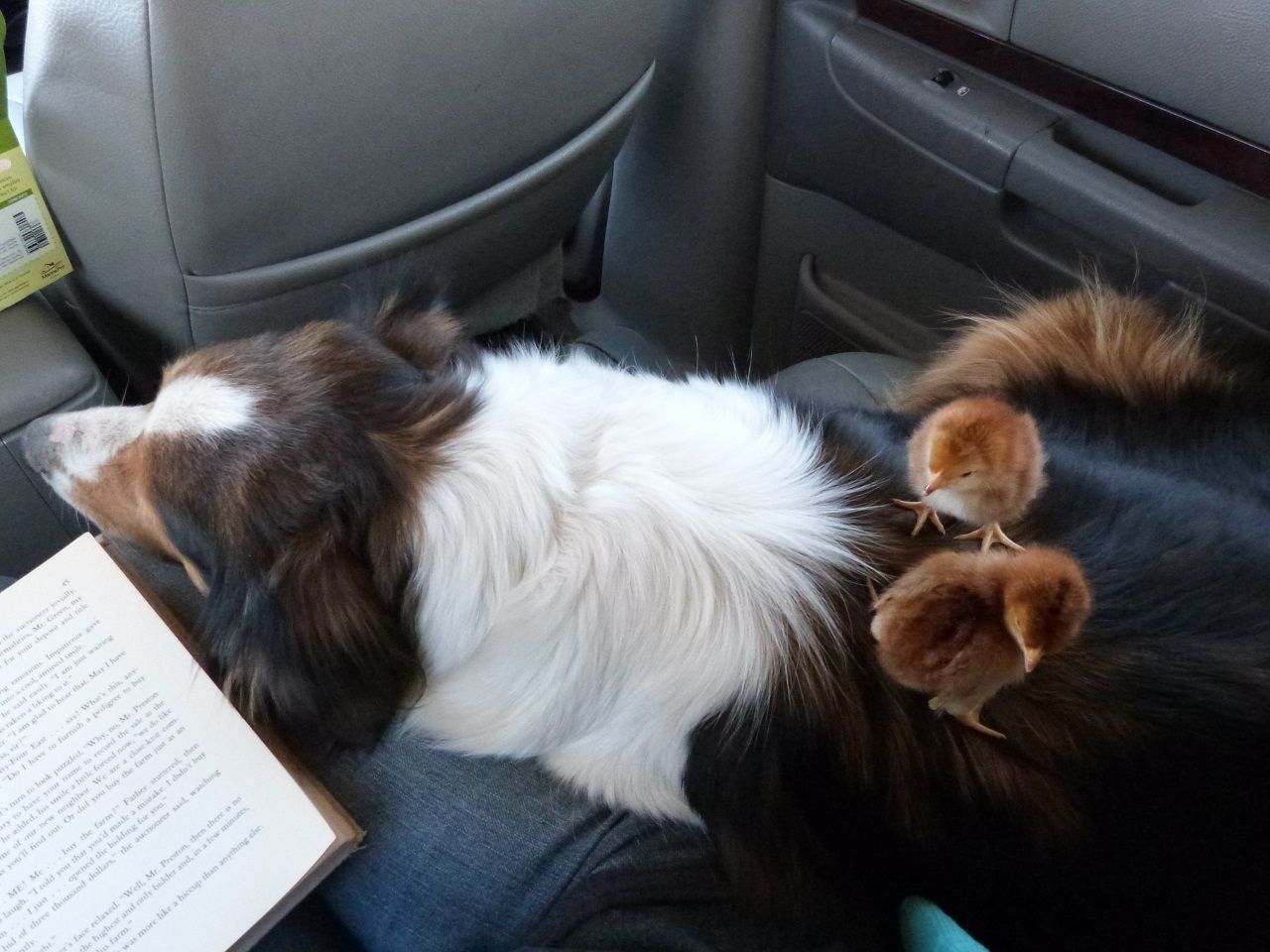 Here are 2 of my babies with y Scotch Collie on the ride home from the hatchery.