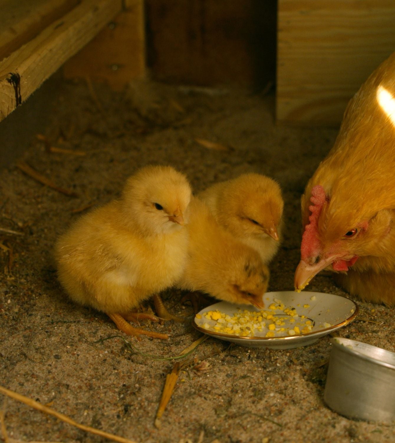 Momma teaching the little ones about food (boiled egg)... I noticed she was even finding little sand grit pieces that she would pick up and lay down to them which they would eat. Within 10 minutes I noticed they were all selecting their own sand grit. As a treat I offered 'Gulon' a small bit of sesame seeds (which she loves) which she began to gobble down. Then she offered one to the little chicks and two of them tried to take it but apparently had problems munching on it so they both dropped it and didn't attempt to eat any more of them. Gulon, in turn quickly gobbled down the remaining seeds.