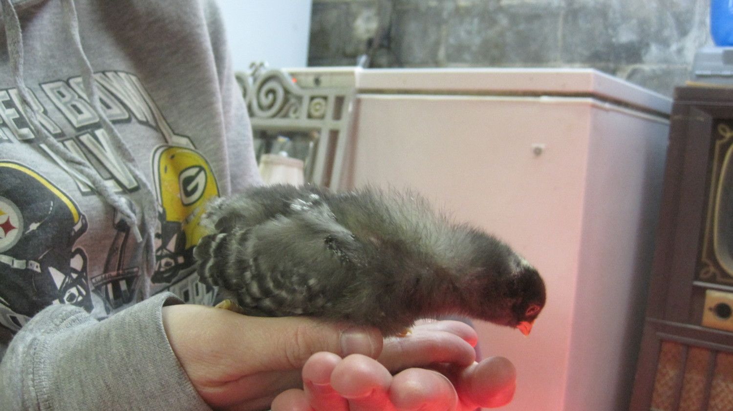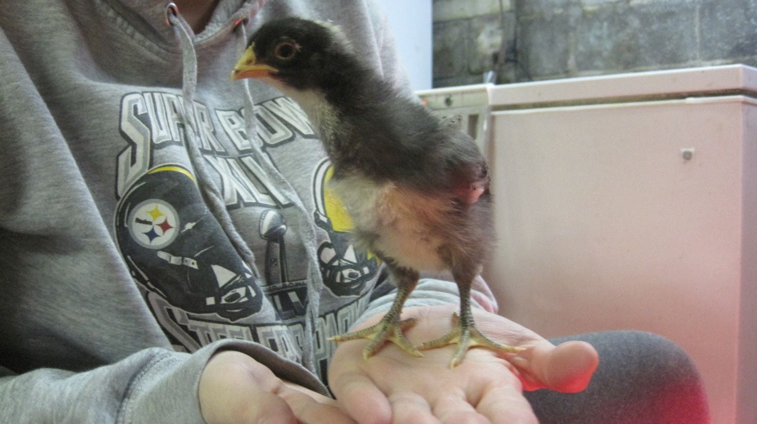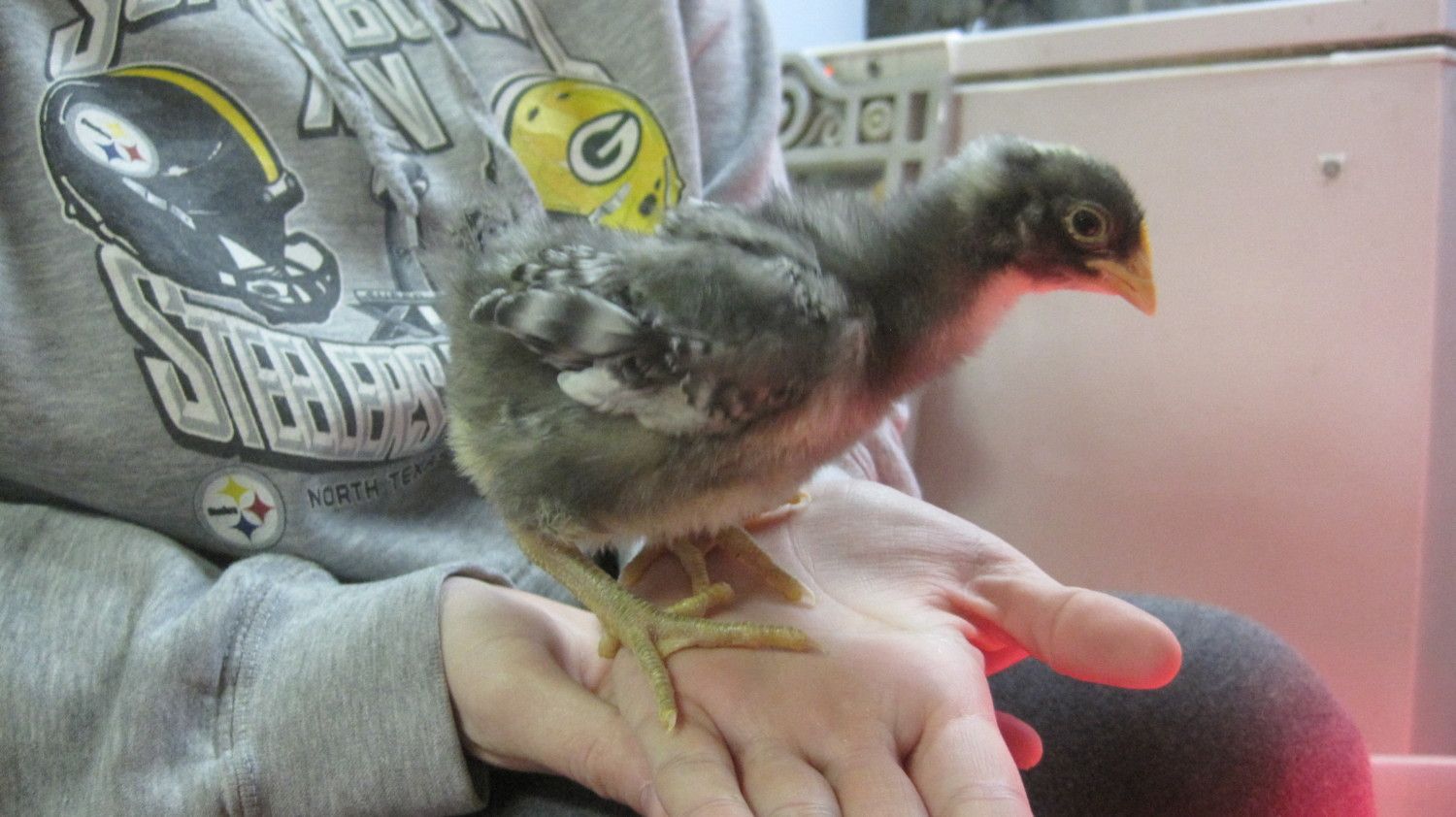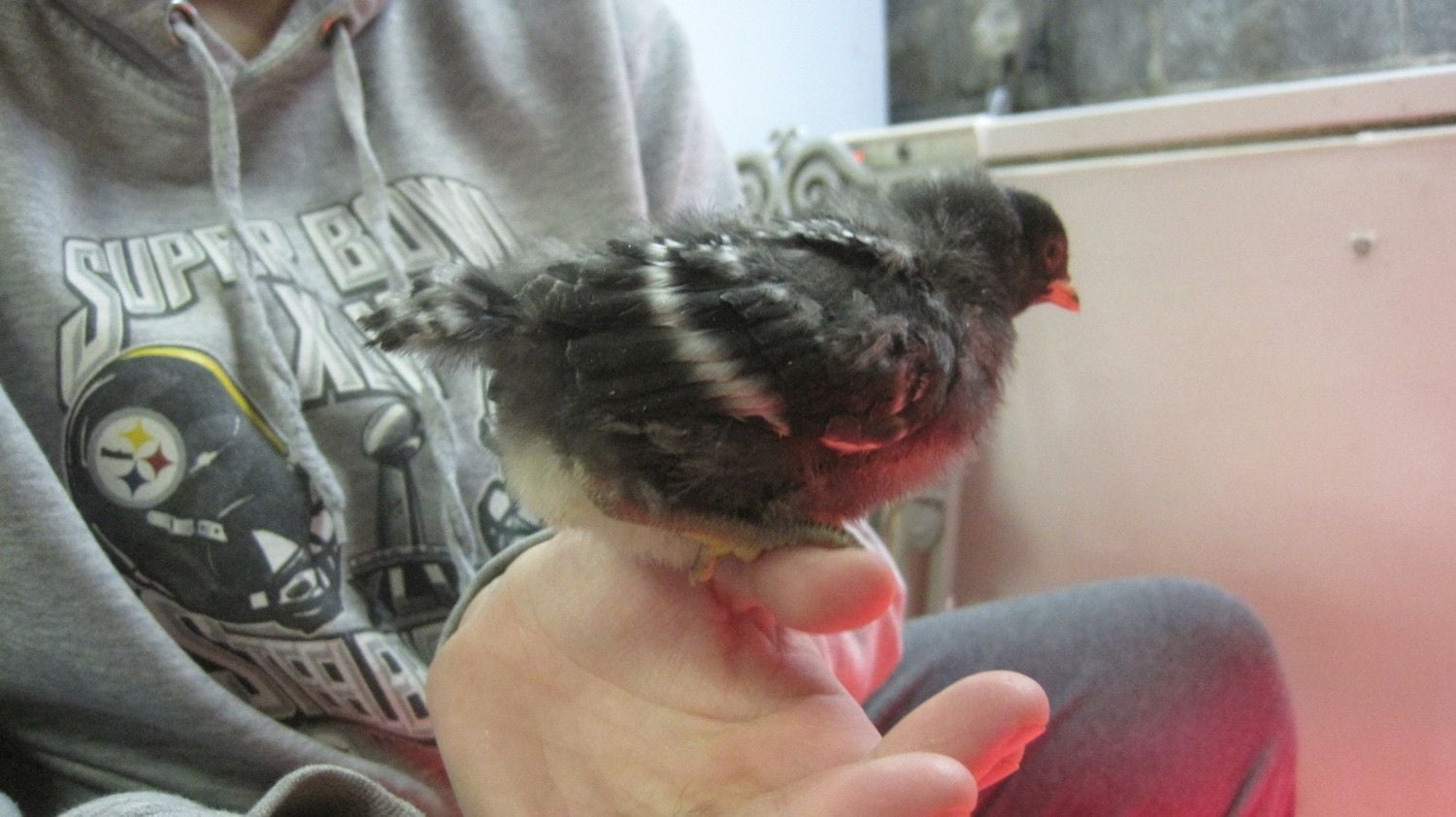 Thanks! They've been mixing it up between their 2x4 roost board and on their bellies under/against their stuffed dog :) One's taking to nuzzling it to the point where I'm wondering if she'll stay attached as she gets older. It's very cute.