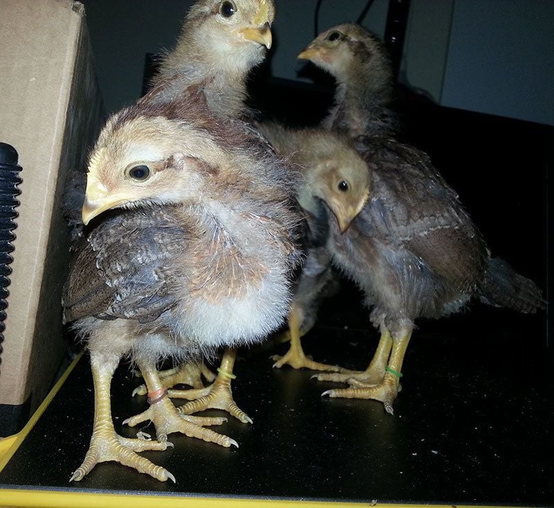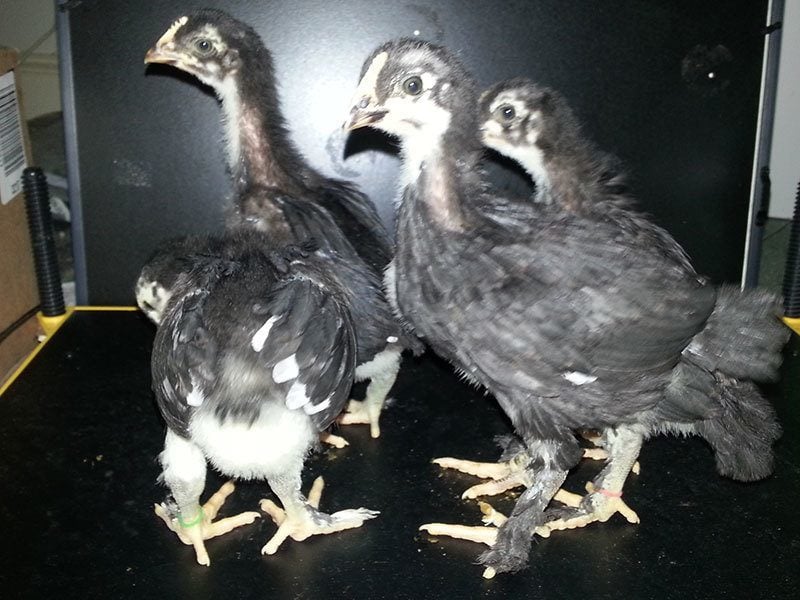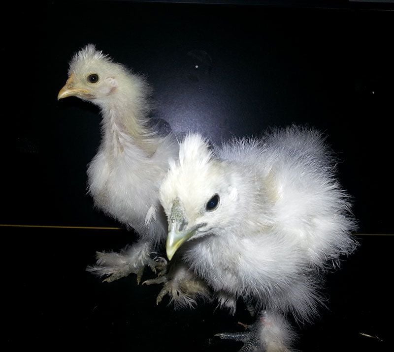 they are either Silkie X EE or Silkie X Silkie, I'm not sure. I thought they were silkie X EE crosses, but they are coming in with silkied feathers, and you have to have 2 silkie feather genes to make that happen. notice once has a yellow beak. what gives?