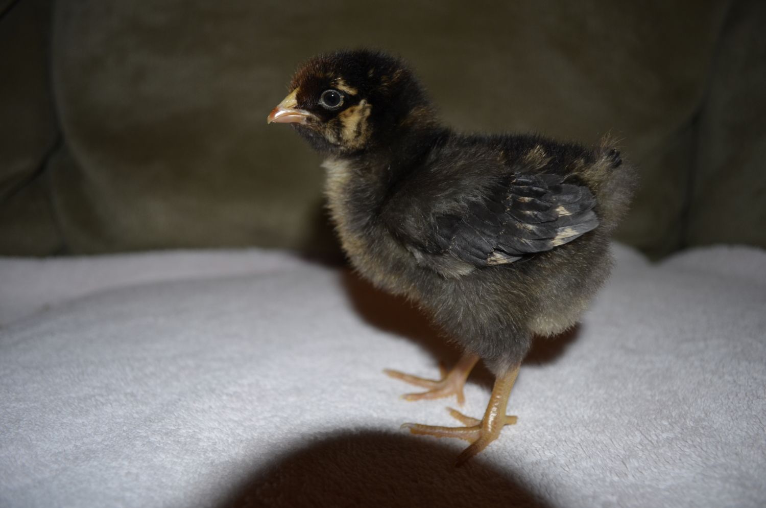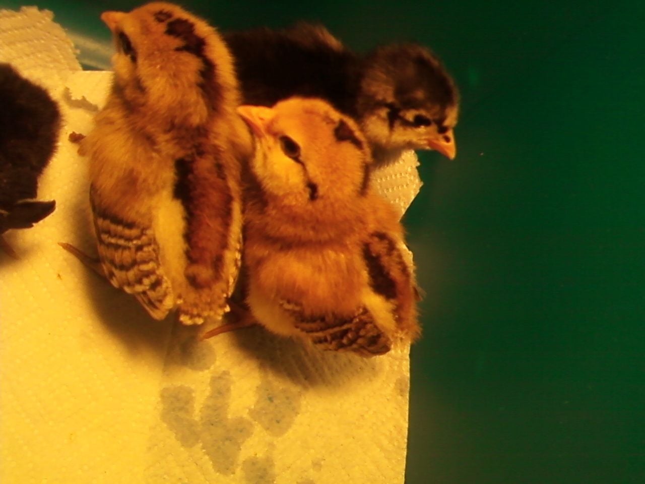 here's all six that we got Sunday from a feed store (our first ever chicks!) three Black Australopes and three EE's. The yellow EE is my son's and the runt BA is my daughter's. Yes, basically the two snuggled together. They've really taken to each other. [COLOR=B42000][/COLOR] Three of them chillin' today.