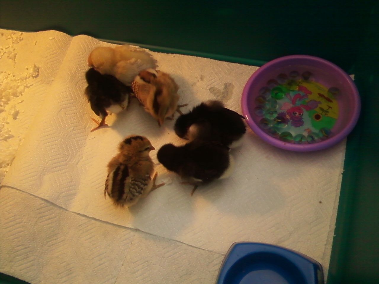 I am no expert but based on my chickens that hatched saturday yours look older than 3 to 4 days. They look real nice though. The silverish BA being curious..and her sister...not so much.