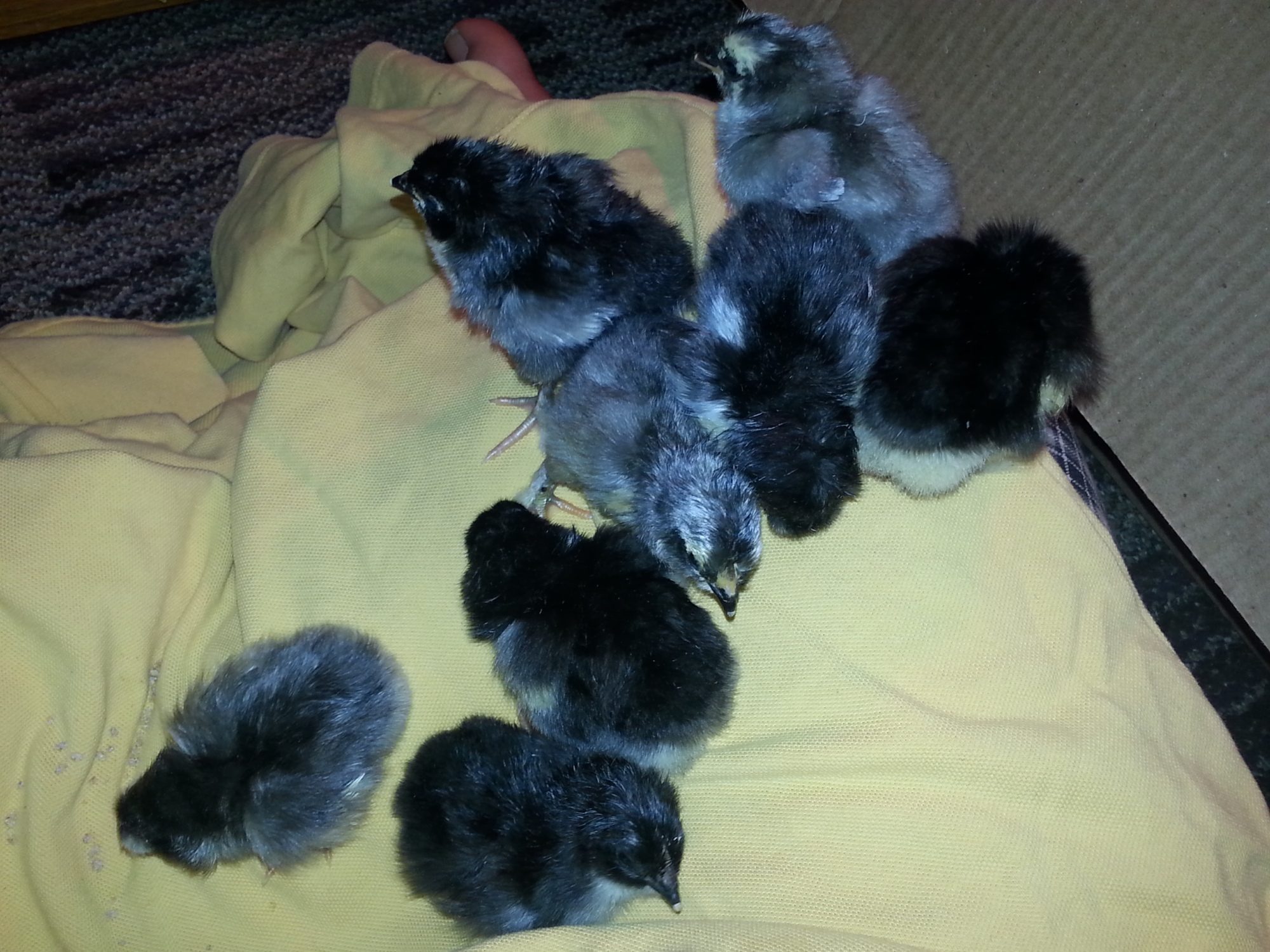 my last batch I got one chick Blue andelusian/blue splash maran, I put him with 3, 3 week old chicks who are nice but it is like keeping one 2 year old with 3 ten year olds- I have a friend who may give me BCM, isbar, or legbar chicks so he can be with younger chicks on thursday. then 4 eggs due to hatch on Sun.Hold on little guy!