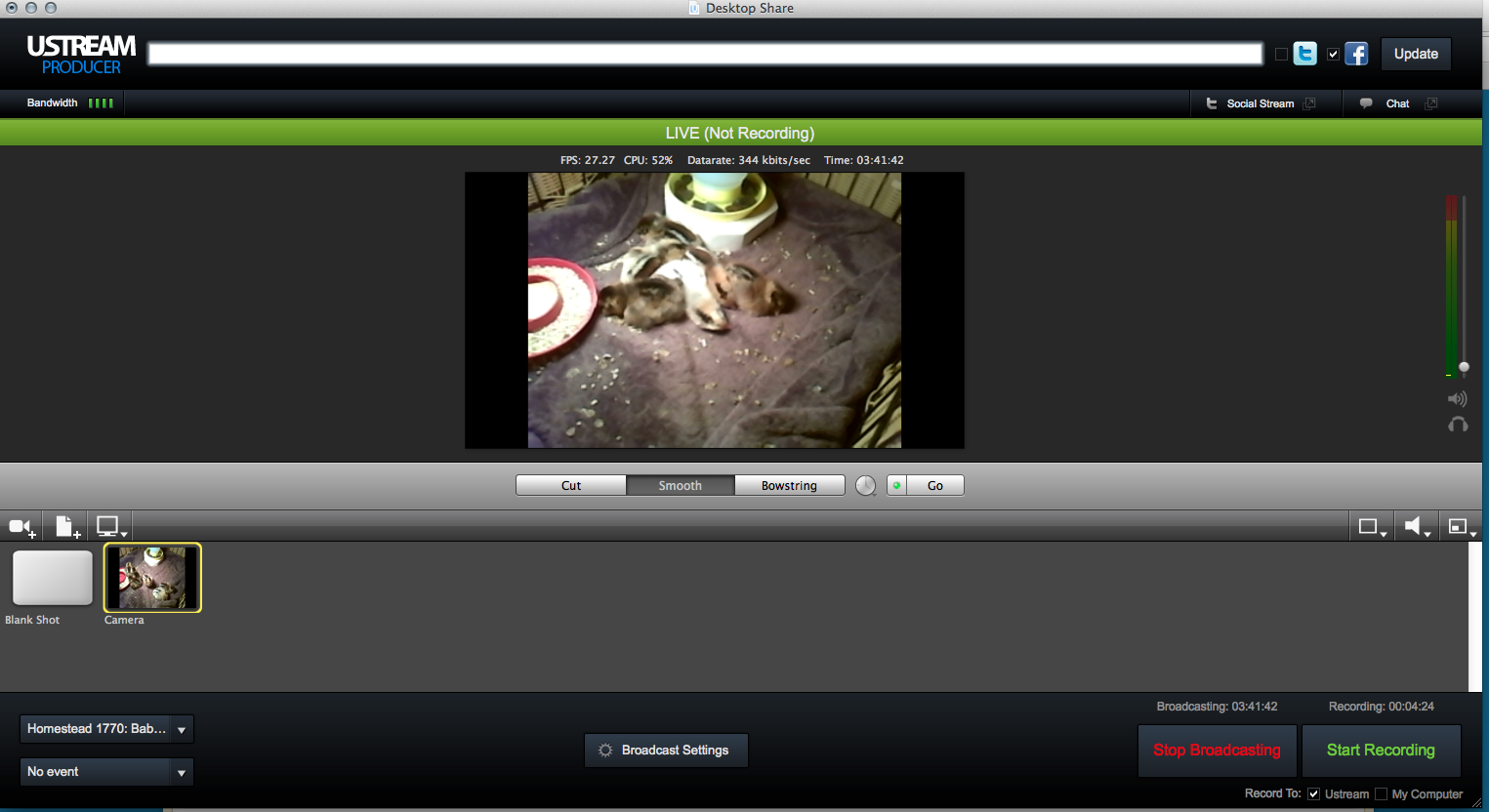 9. Bottom Left side you will see "Broadcast to Channel" Click on the drop down menu and you have to now select the channel you set up in your USTREAM account. Mine was Homestead 1770 : Baby Chick Cam