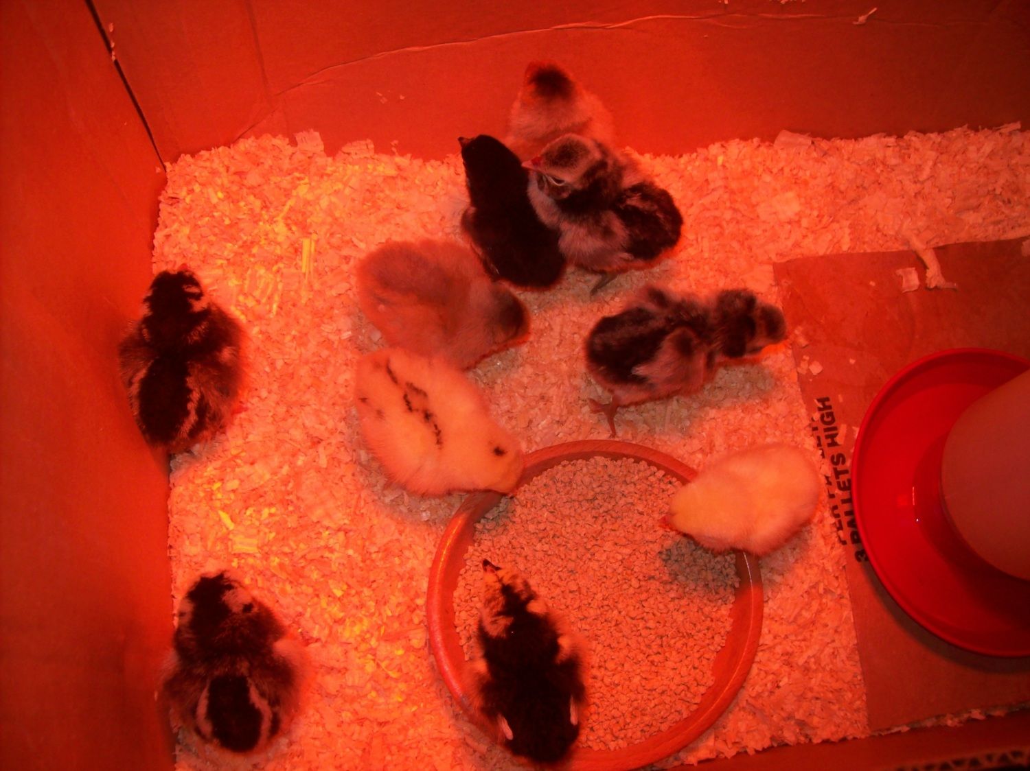 . All out in their new coop like big kids. Although I think the big ones are pushing littler ones around. When I went out they were laying in the pine shaving in two groups.