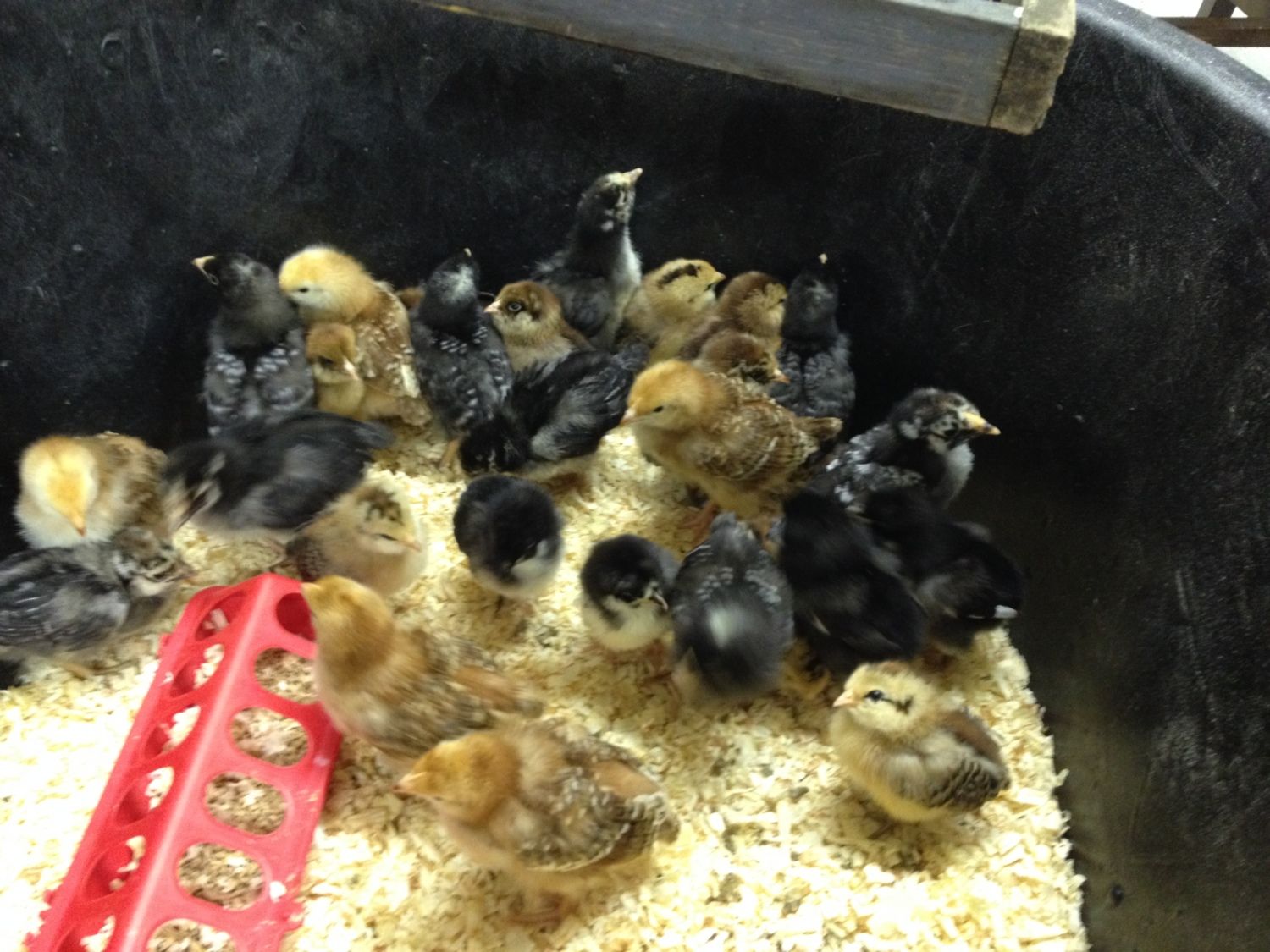 with the baby chicks as toys. One guy hung a few pieces of ribbon up over his box for them to have something