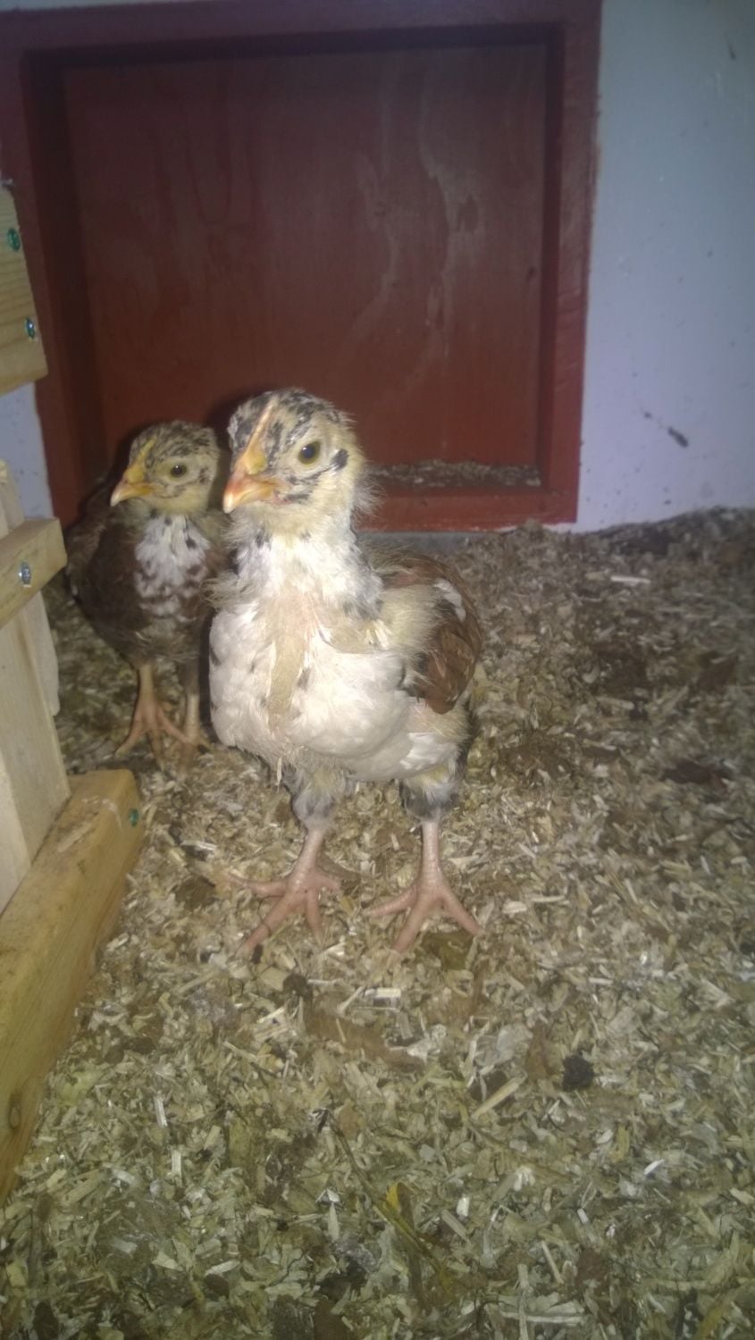 Any guesses on gender on these? They are Speckled Sussex'es, at 5 weeks right now. My guess is that the lighter one's a dude. The darker one is a bit more camera shy (Out of 30 shots these were the best =] )