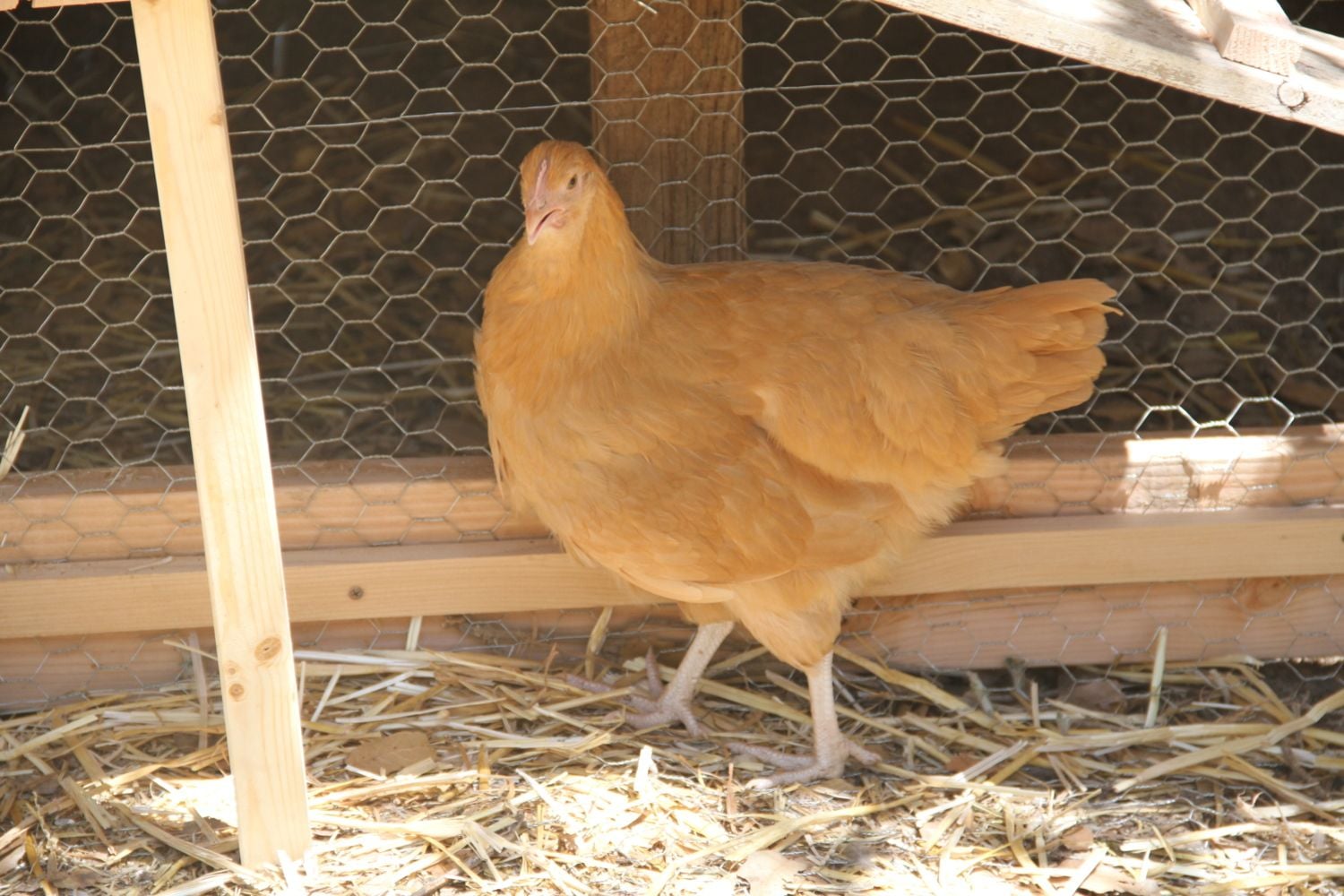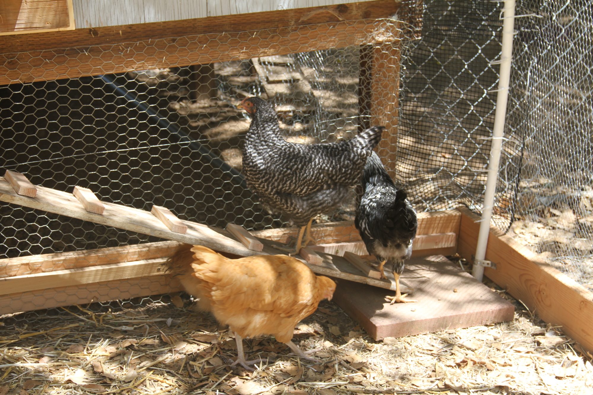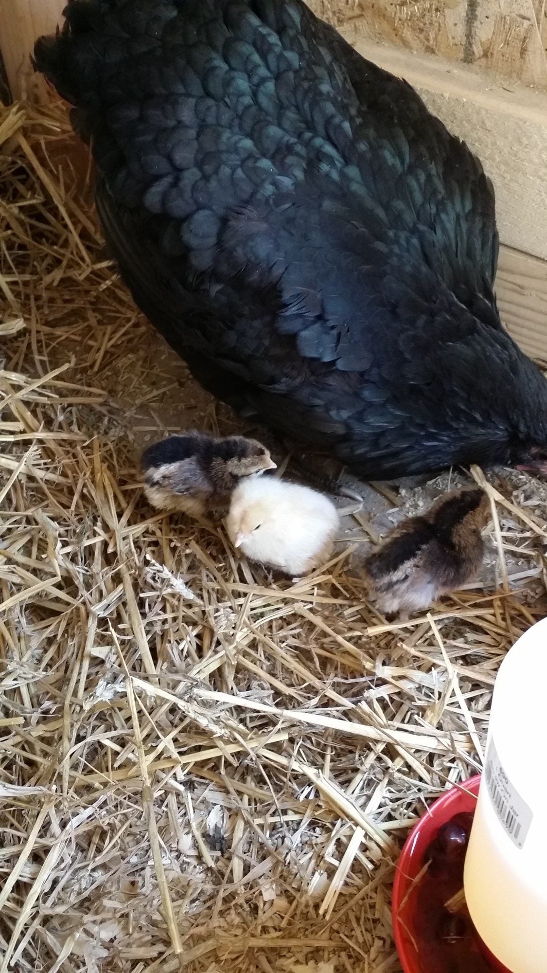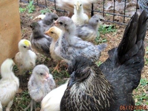 Even when I got our 1st 6 Production Reds in Feb 2011 and then in April 2012 our 4 EEs and 2 CMs... So I have few if any pics from 2011, 2012 and most of 2013. In December 2013, I got 4 young birds - 2 of which were roosters. The two hens were with me (flighty as all get out) until April - then suddenly disappeared. Not sure if they became hawk bait due to their colaration (white) or if they just were able to fly off. The rooster doesn't seem able to fly well - but he CAN get into the tallest rafters in our barn. The LF is supposed to be a "super layer" - AmeraucanaXleghorn. The 2nd is some type of OEG Bantam... He was given to me when I showed interest in him - he was fighting the guys' other roosters. I thought he was cute/pretty. He's developed into quite the young man - and I'm pretty sure is the sire of most of the chicks that just hatched on May 23rd. Thru BYC, I found Blue Ameraucanas and purchased 8 which I was able to "graft" onto this Banty hen, too. So she's "mama" to 17 chicks right now.