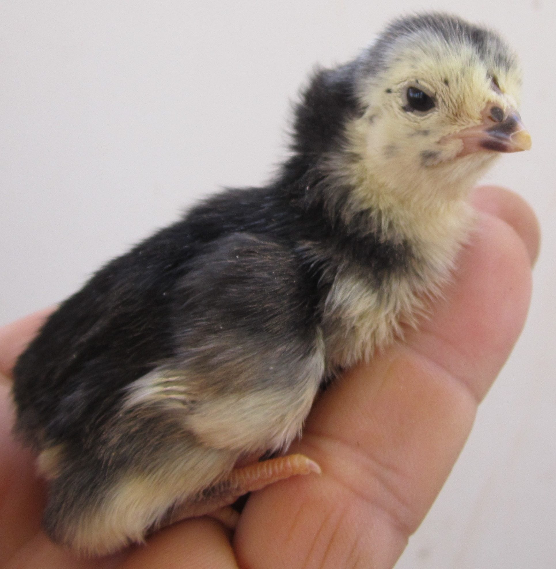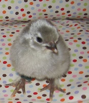 Grayish fluff and feathered purple/black feet, to me it looks like a Lavender Silkie. I have white and a blue Silkie and this is what they looked like as chicks. If only I could get a better look at it's feet and could see a 5th toe I would know for sure. Do a search on BYC's search bar for Lavender Silkie chick and see what ya' think.