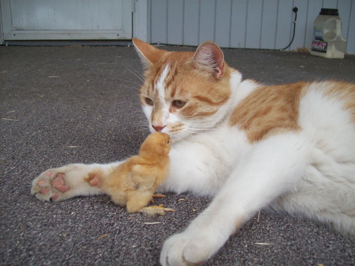 Nature's use of camouflage. Watch as the chick blends seamlessly with the cat...