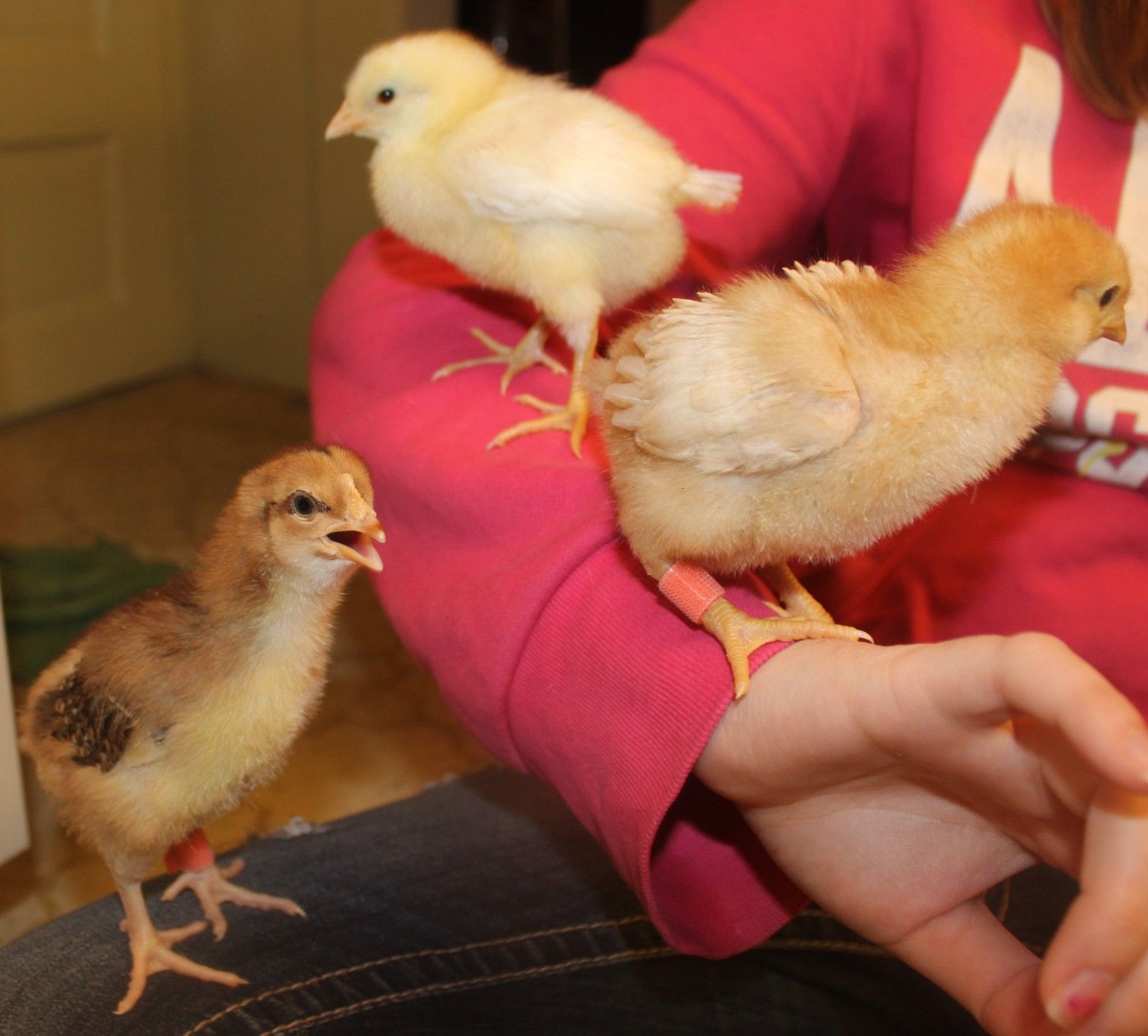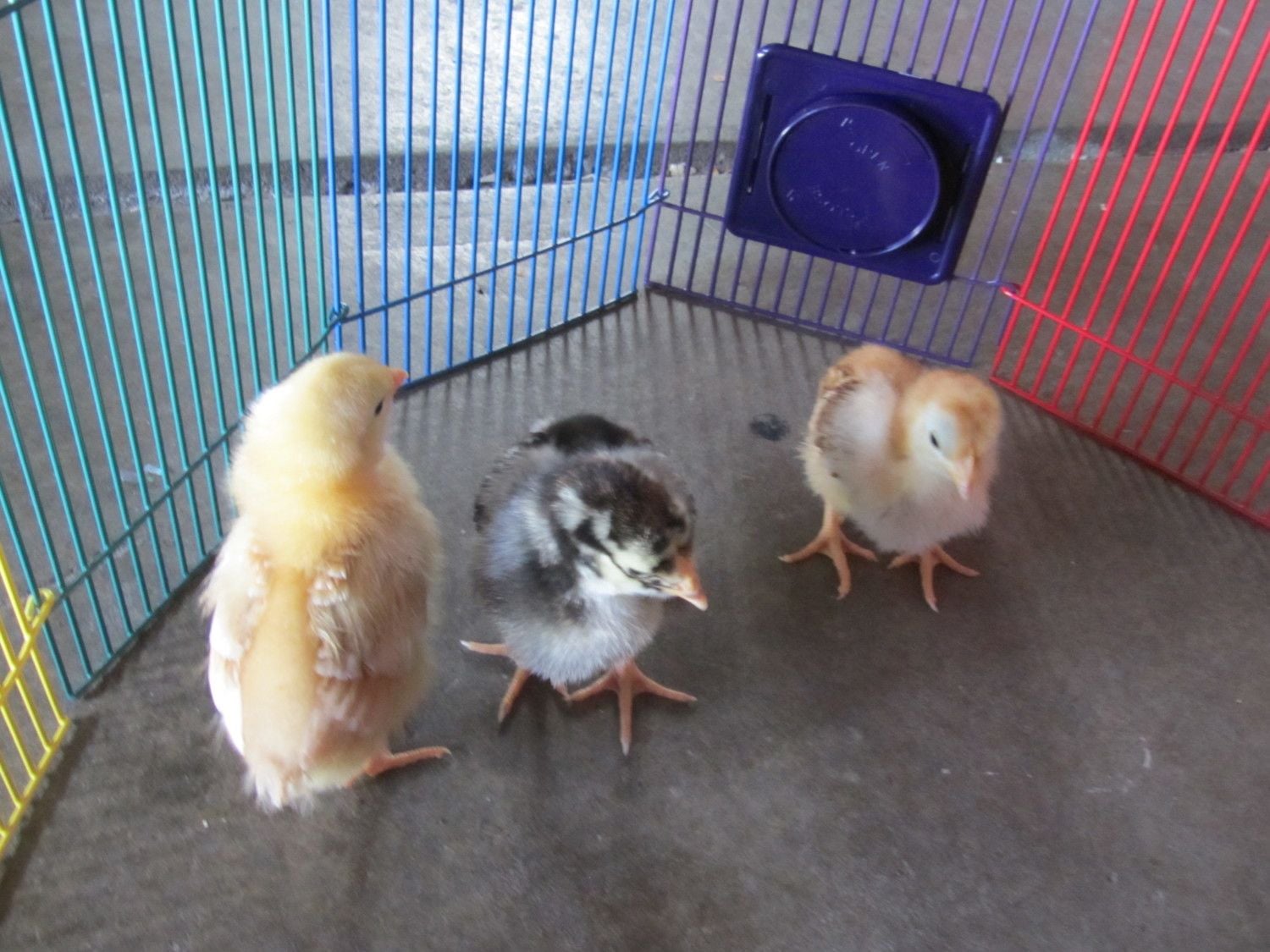 Had to share this! Here are my three baby chicks. In this picture there is a New Hampshire Red mix, a Silver laced Wyandotte and a Rhode Island Red. The Wyandotte and RIR are roos. Can you tell?