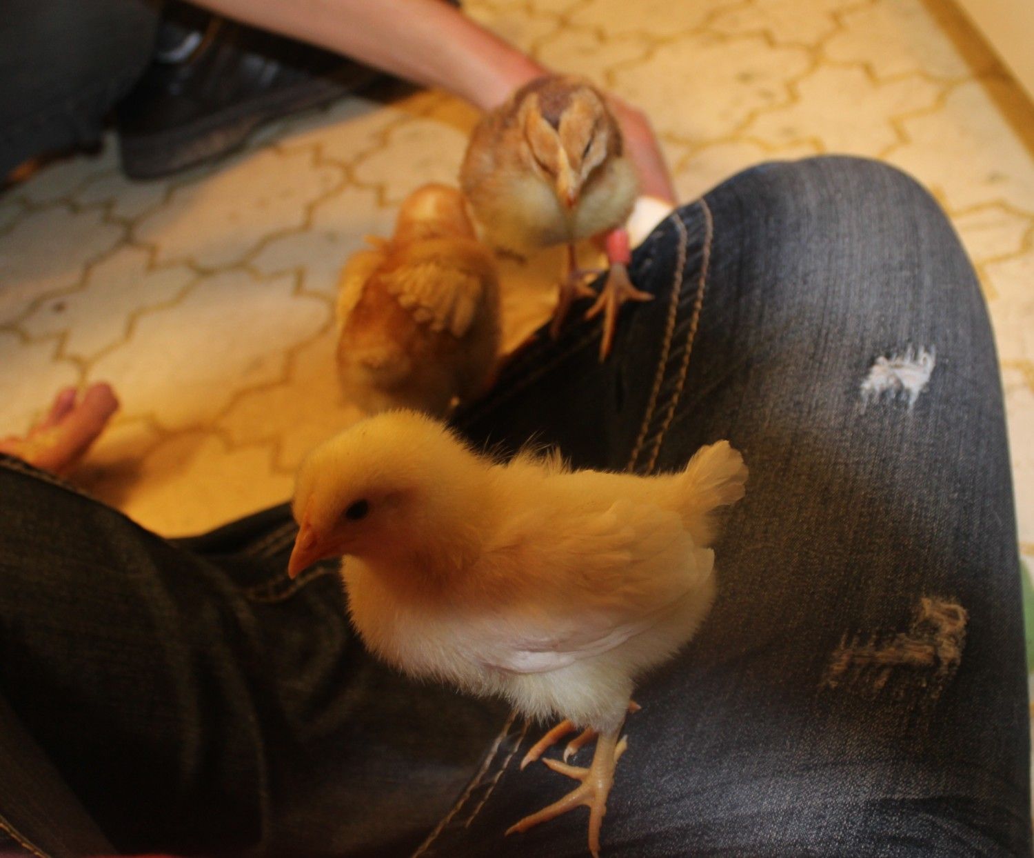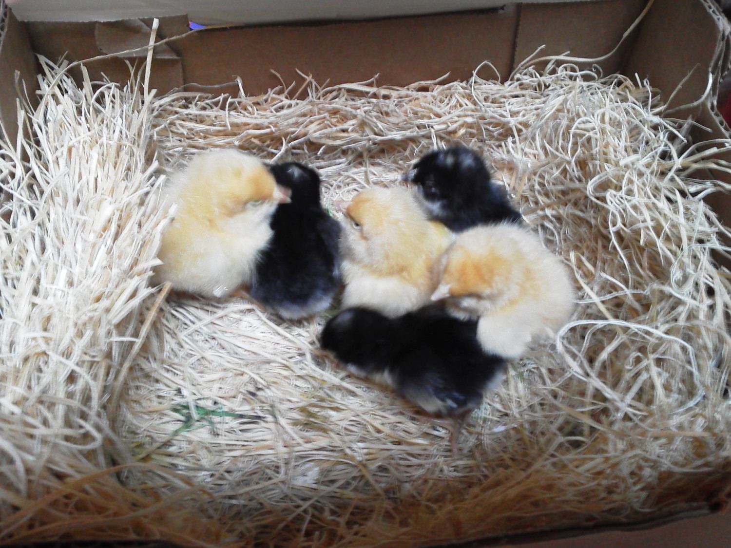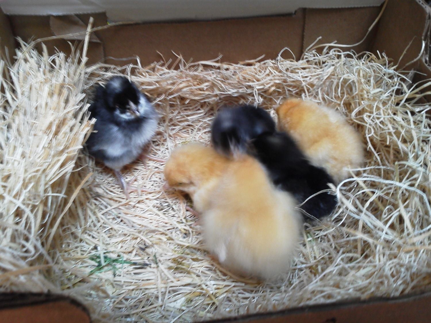 here are a few pictures of my babies, one of each breed. today was the first day they were allowed out of the brooder in the kitchen to roam ( easy poop cleanup ) and where do they decide to go? either napping on my lap or perching on my arm, what sweeties! well, at least they like me ! here are some pictures. they are 11-13 days old now !