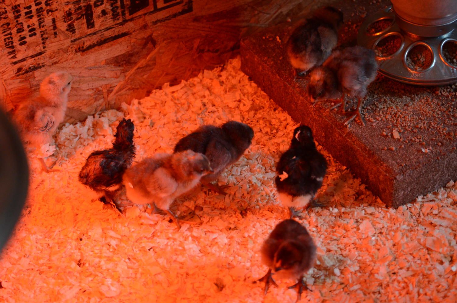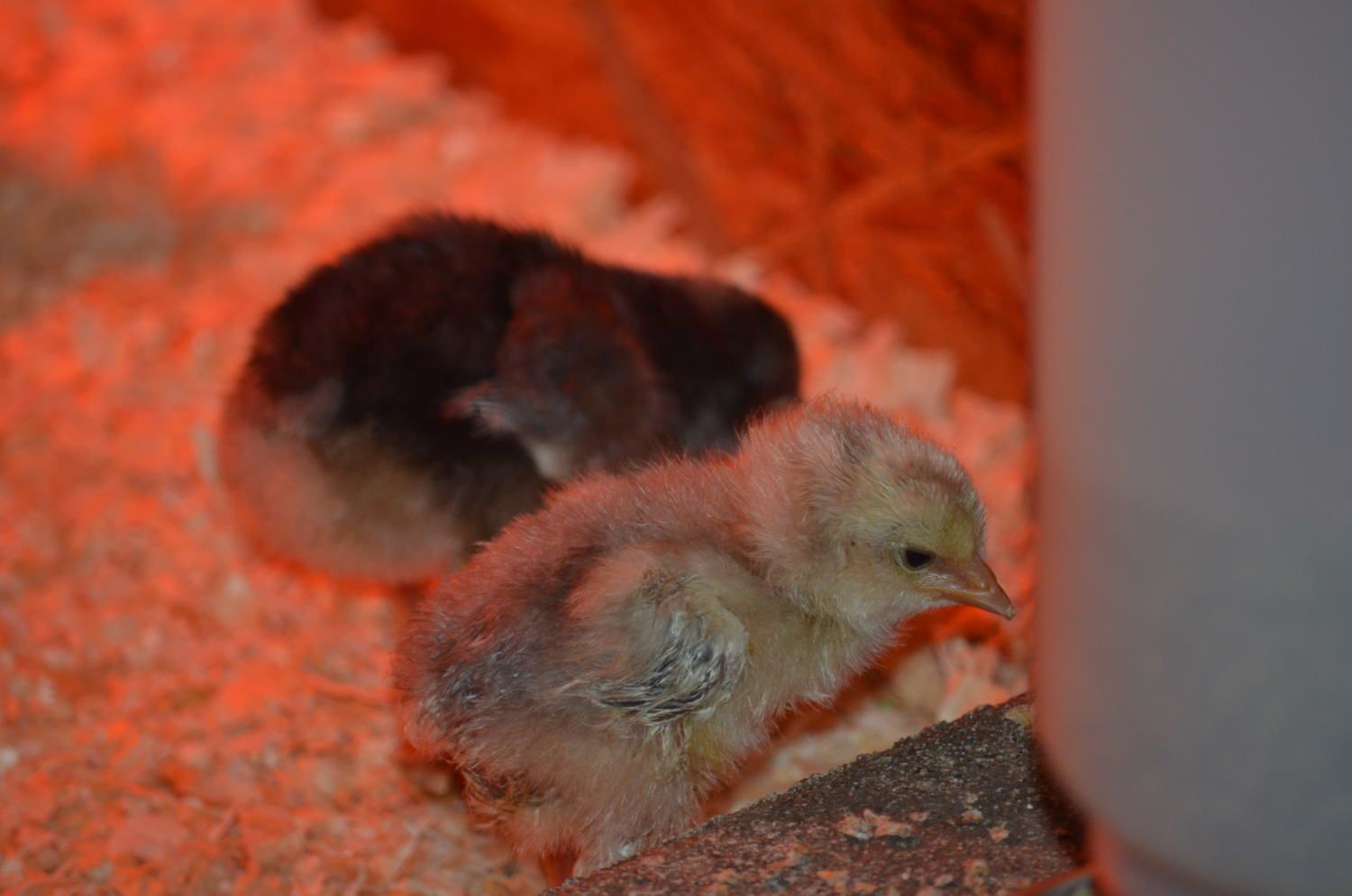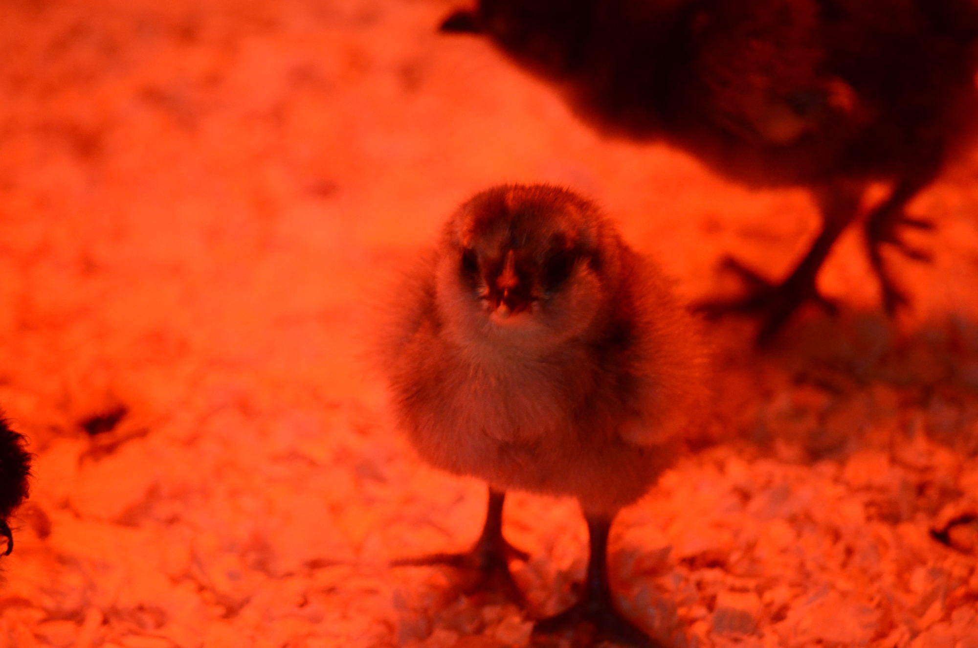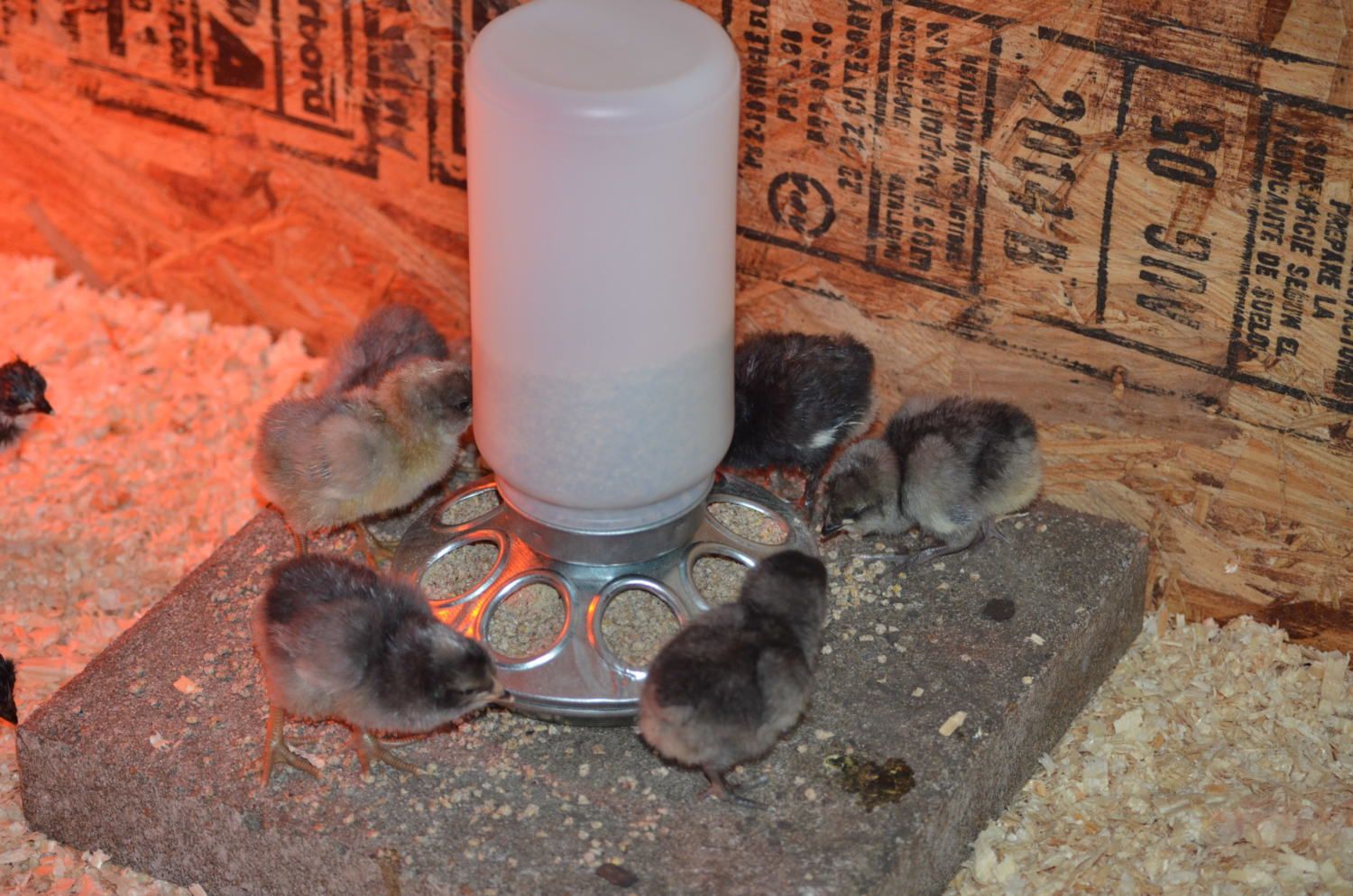 I checked out (they are giving me a borrow on it.) a plastic bin from my local hardware store, it is 4'x3'x4' I put in locked down heat lamps in it to keep bigger chicks warm. and put them in our shed. I can close the doors to keep out predators. They are out of the house. chicks are 4-6 weeks old. temp is 80/85 under the lamp. If they get cold the can get under. they can move away if too hot. in pic they are not under lamp because they are eating.
