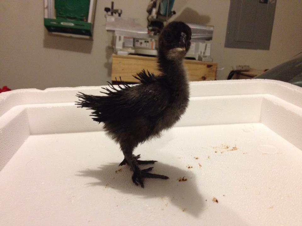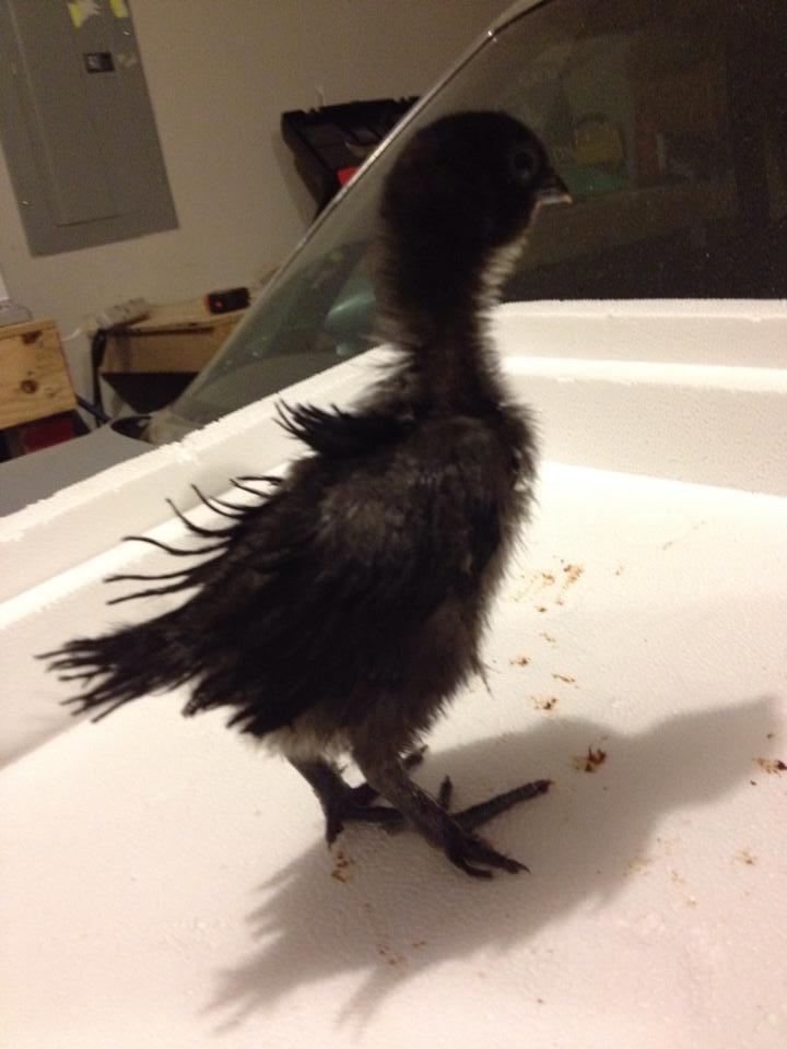 The little black Showgirl runt. She is either sleeping or hiding from the bigger birds almost constantly.