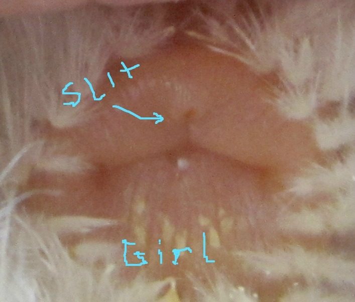 Below is what a girl looks like see the slit on the top part of the cherrio? This was when she was a chick.