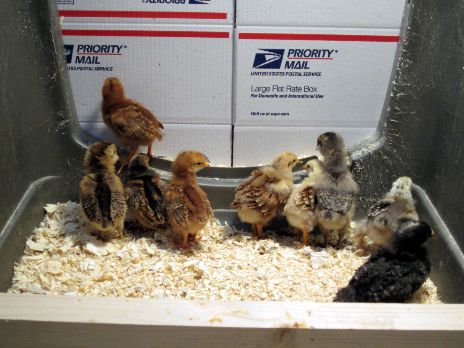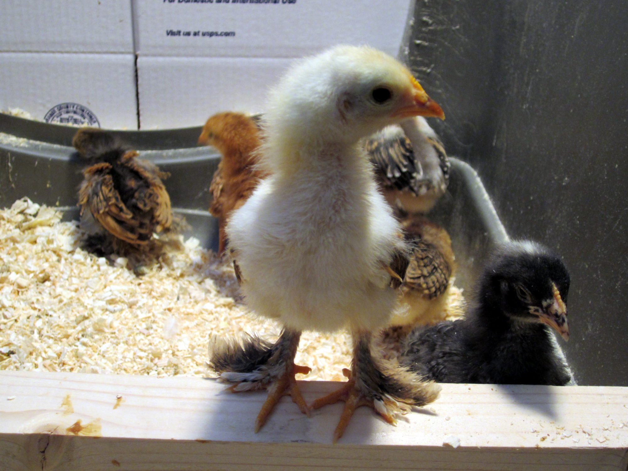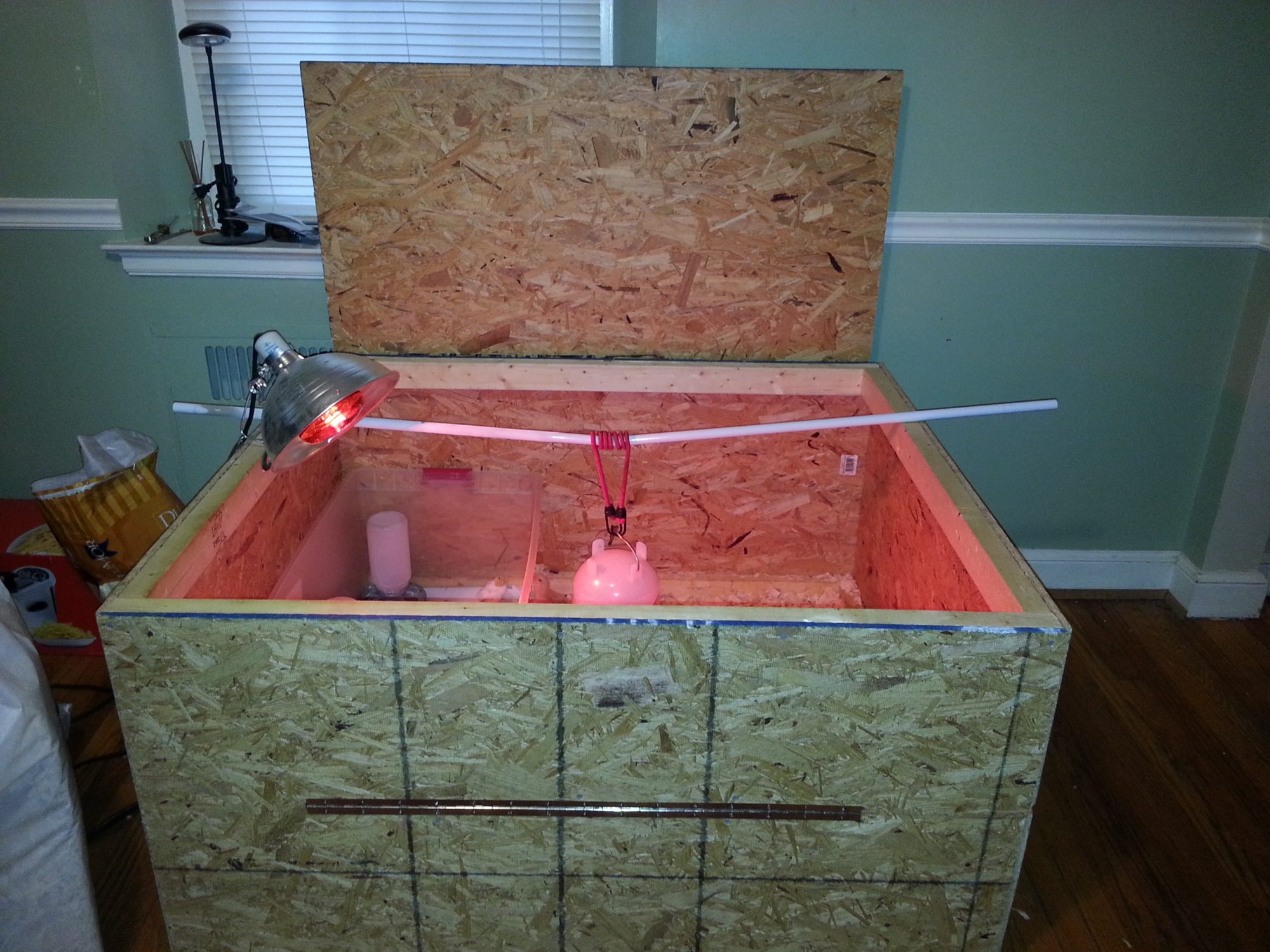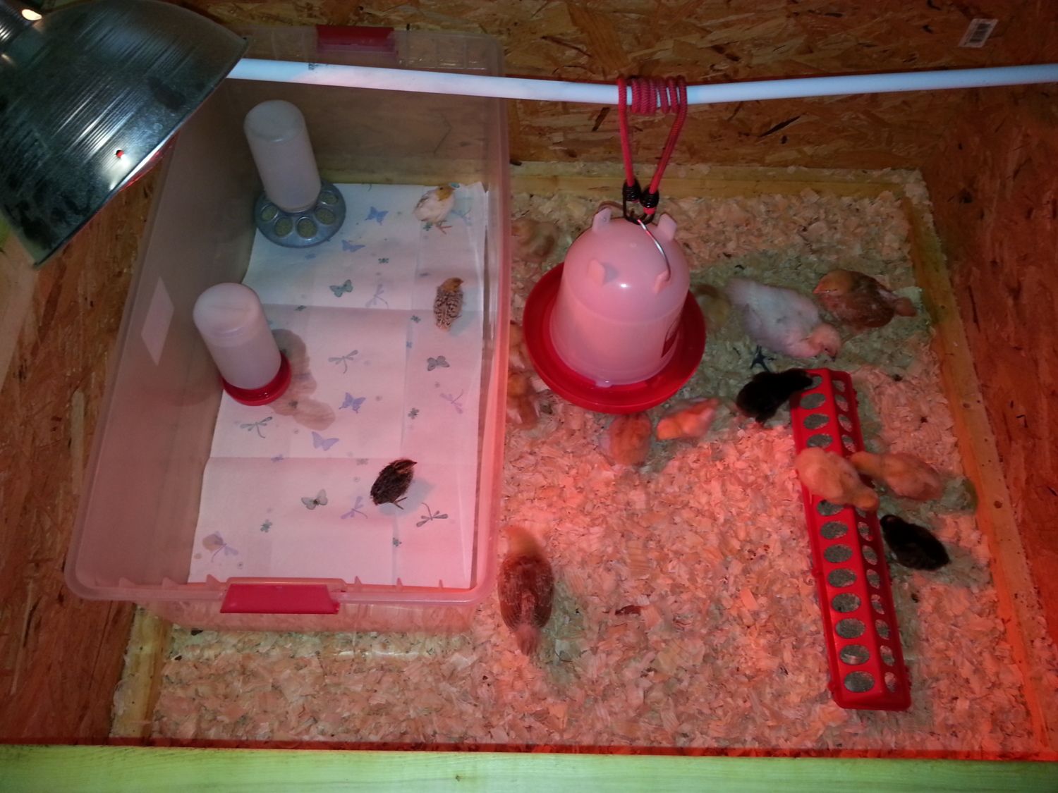 This is actually an old whelping box I made for our last litter. It measures roughly 5x5 and 24" tall. It has a split in the front where it folds down. Serves the purpose well! Currently there are 13 chicks and 3 Quail (rubbermaid container).I really like that brooder box how big is it (height too) do you cover it how many birds to you put in? I have been using totes and a couple of bigger wire animal cages but my DH is building me an actual movable box next weekend! Thank you![]()