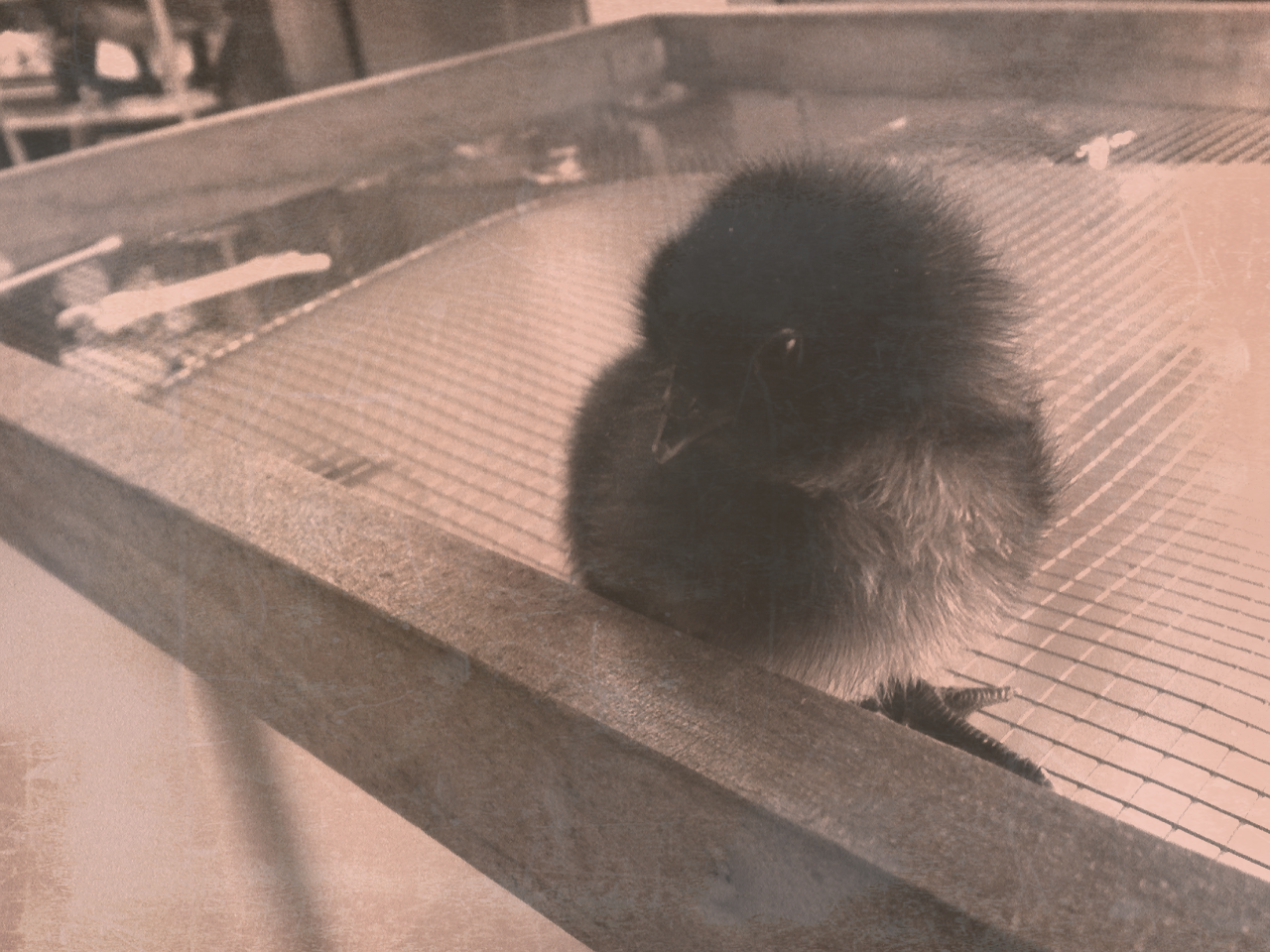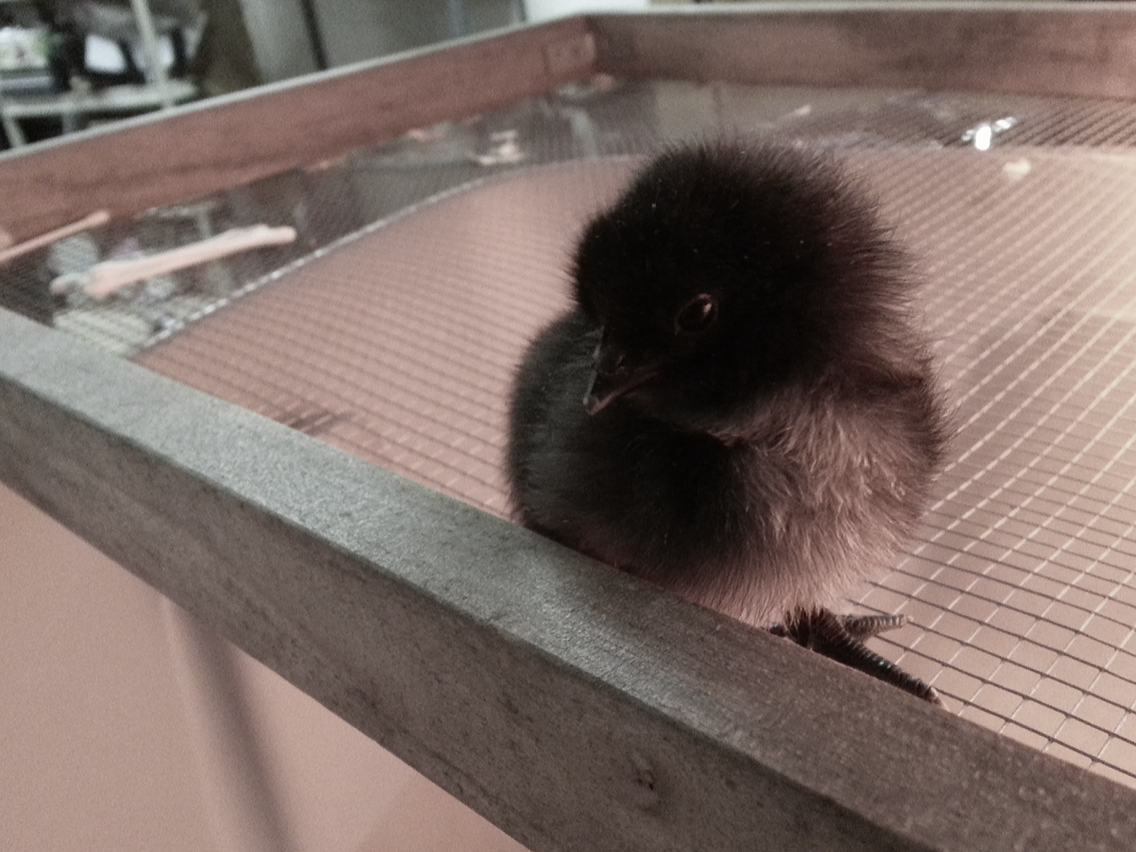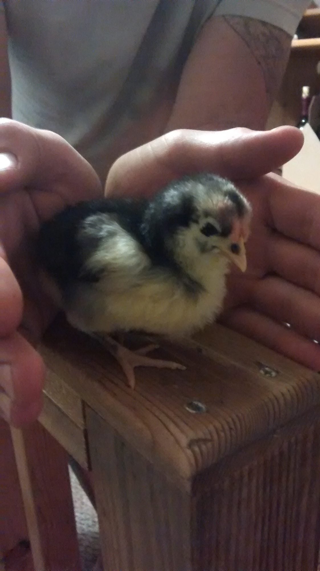 I'm pretty sure the two chicks in my photo are black australorp crossed with a Cuckoo Marans roo. They look a lot like your chick.