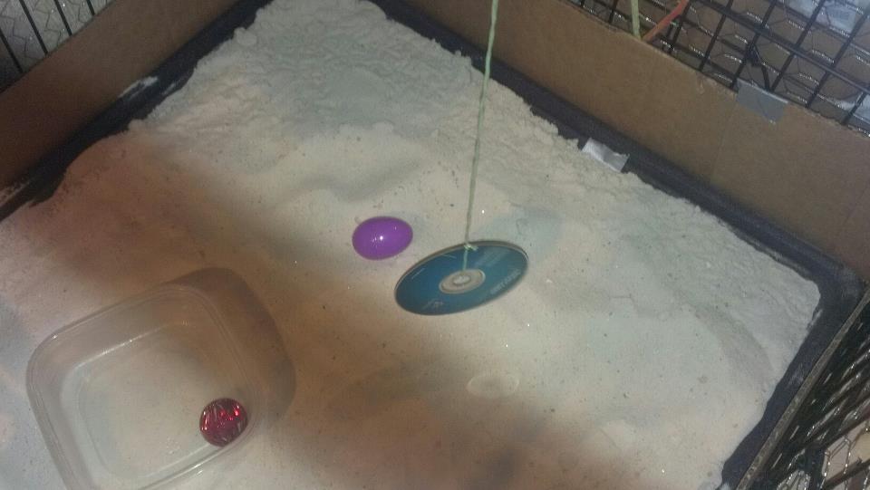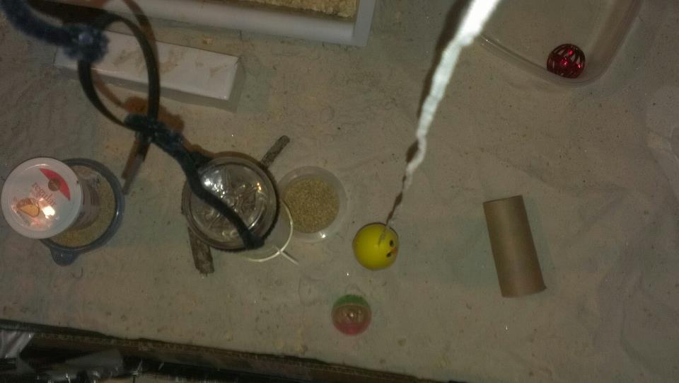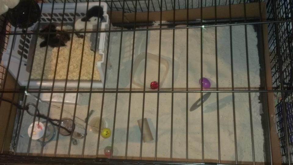 The only area that's not sand is the bin they sleep in, that has a good layer of pine shavings. They sometimes burrow under the penguin's wings, lol,