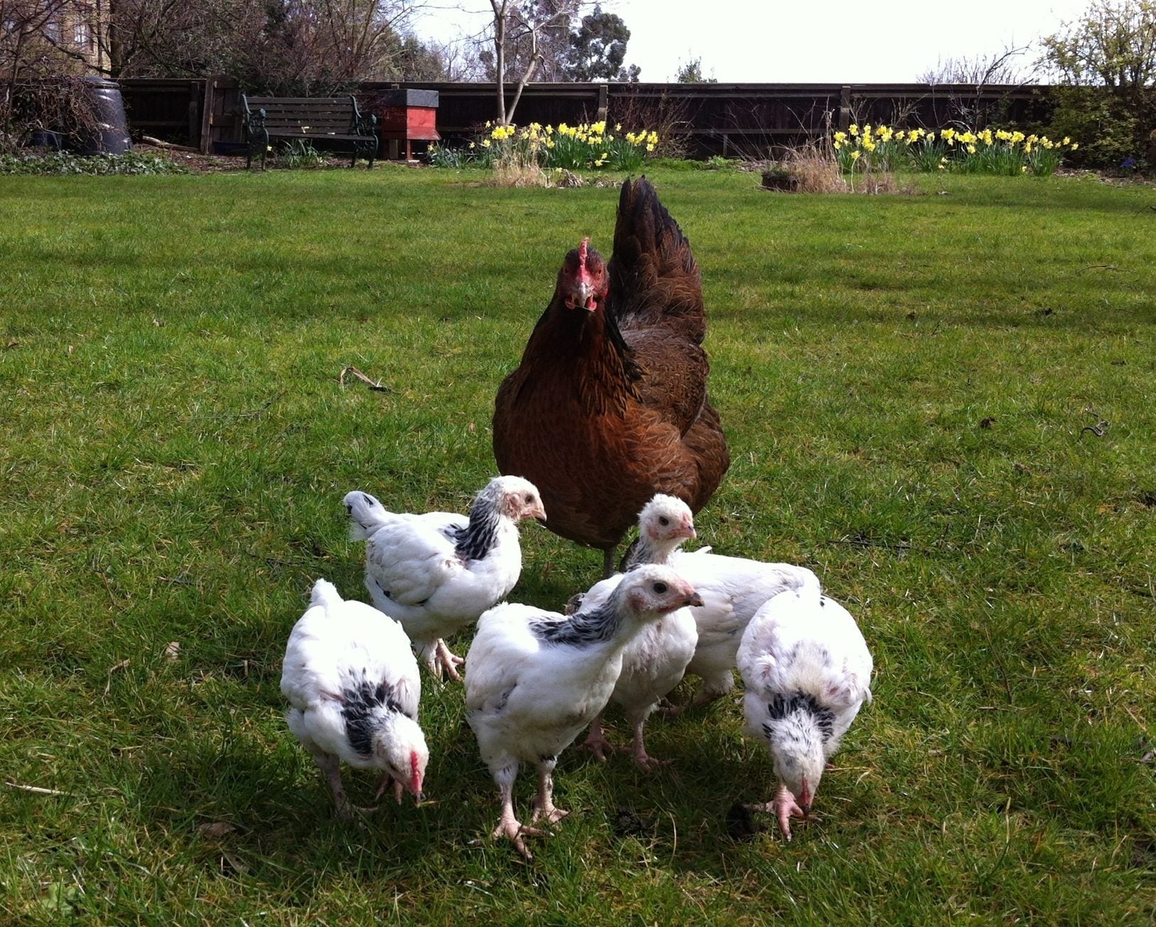 All of my last little batch: 1 Rouen duck, 1 Leghorn pullet (bigger white one with black spots), the 1 Silkie, and the _?_Bantam.