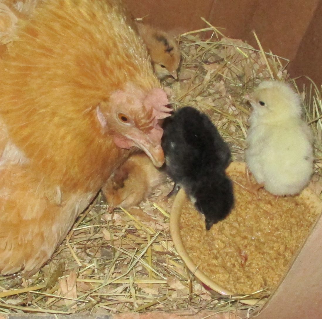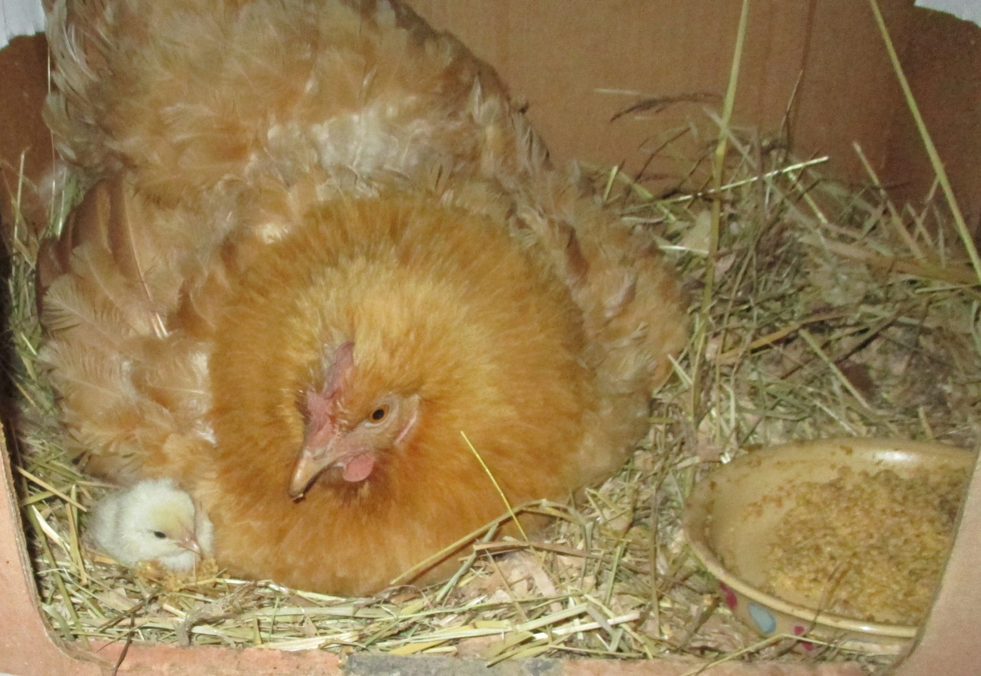 this hen "Tome" is sitting on 2 eggs, she was given 5, but one had 2 many air bubbles, and she ate 2. She did hatch out these 2 babies, 2 weeks ago though.