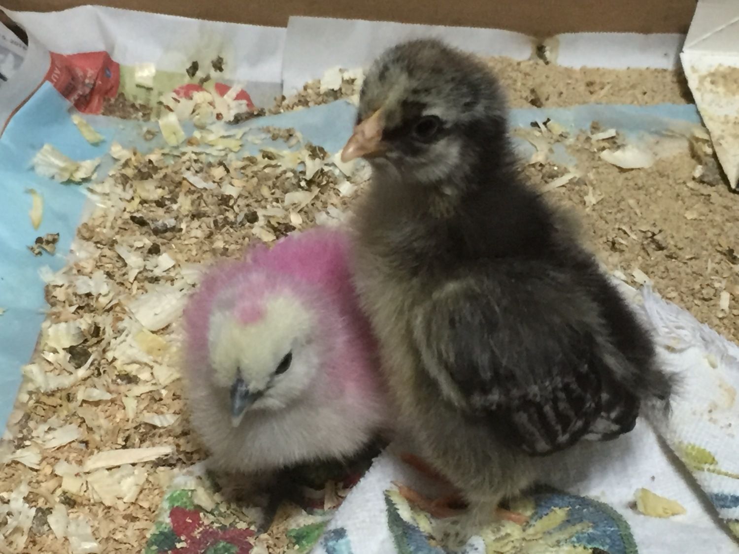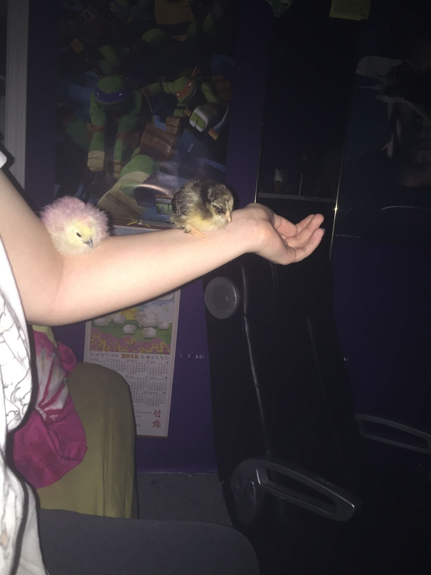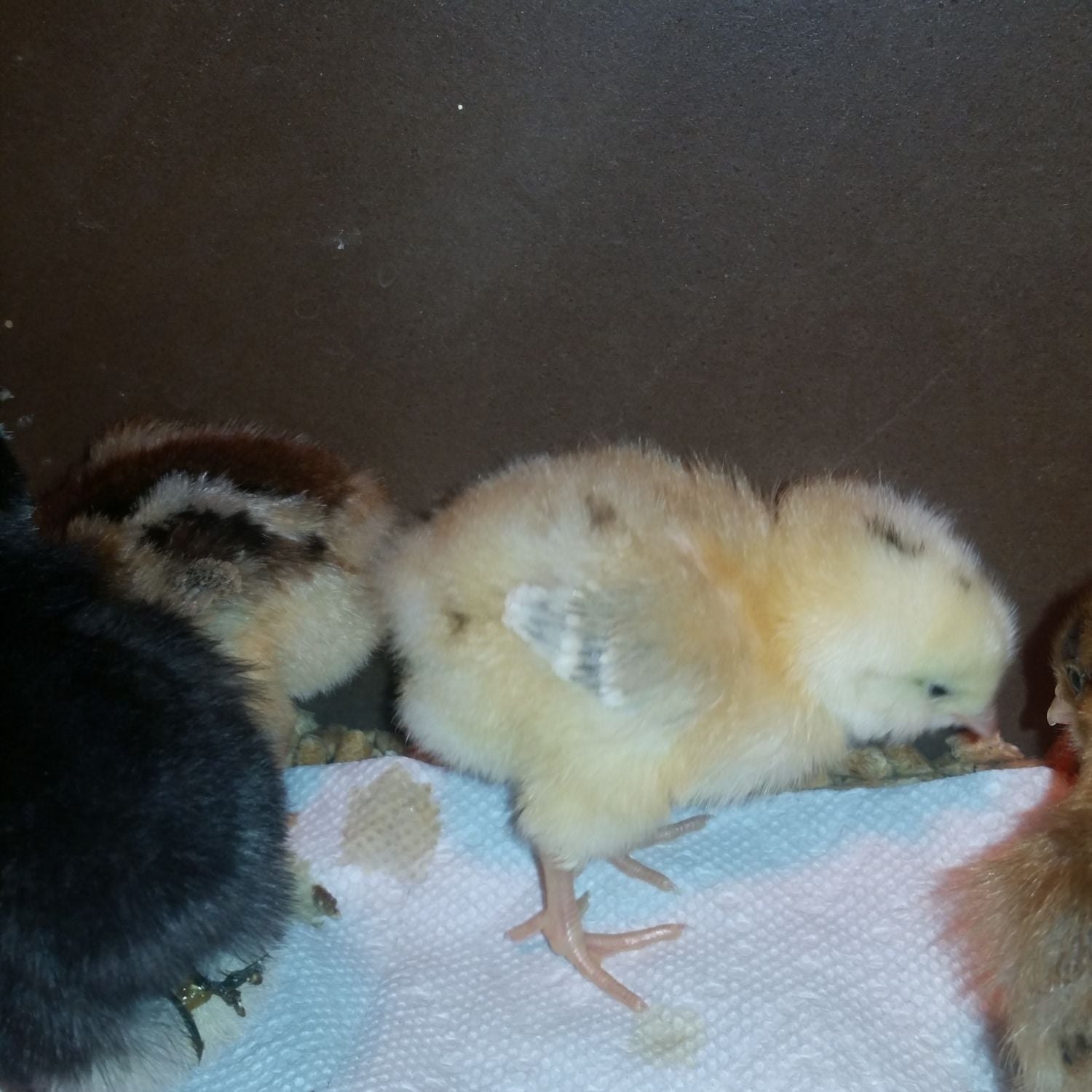 Me: I told you I went to get a chicken feeder. It came with 4 Barred Rock chicks. Lucky me huh?!