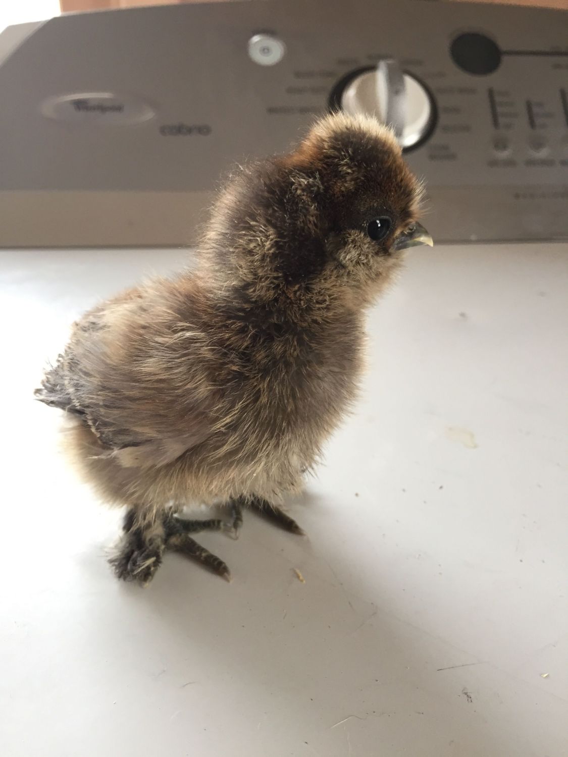 One of our 16(?) chicks. He was an "assorted bantam" I am pretty sure it's a Golden Laced (?) Polish. Any name suggestions?