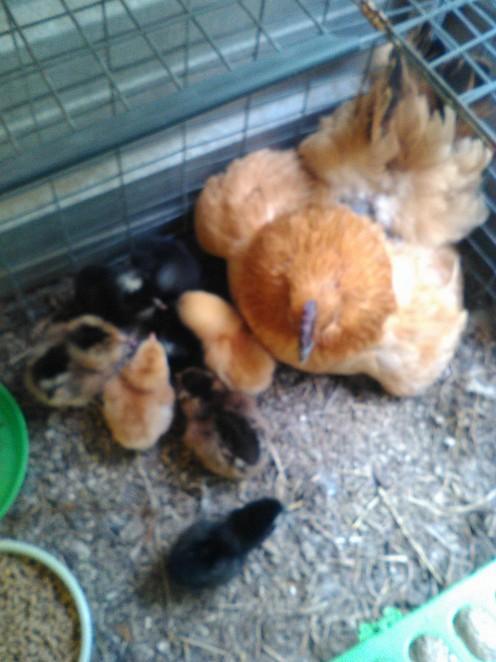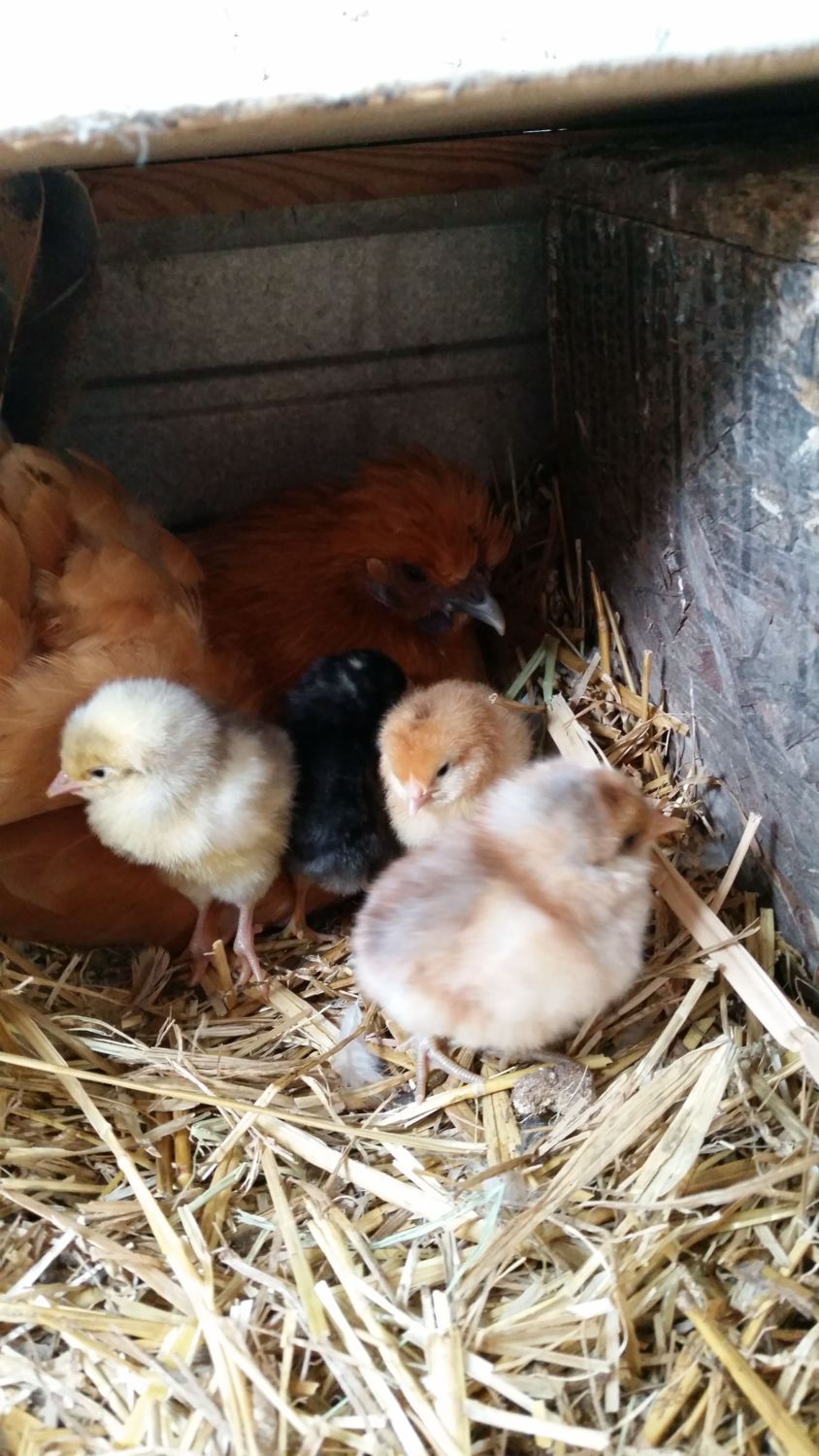 DiDi and her new babies (barred rock, production red, and 2 "rainbow layers")