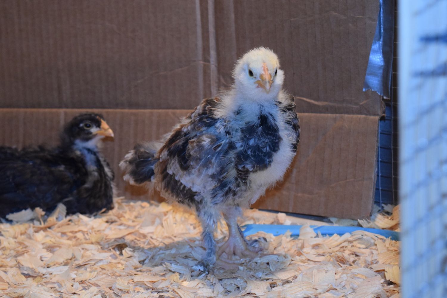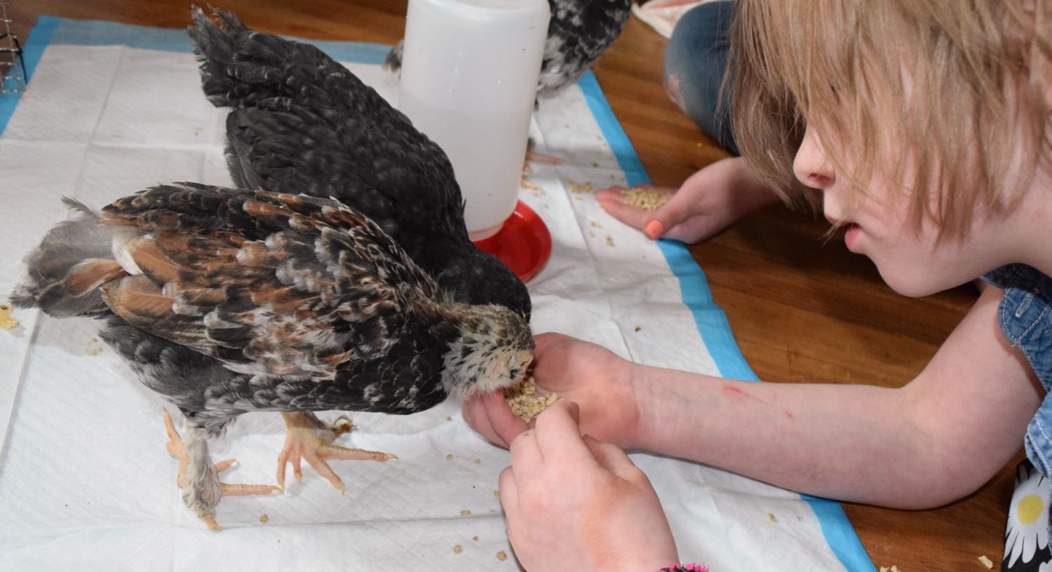 - and a Cuckoo Maran pullet (and my kids having fun feeding the chicks)