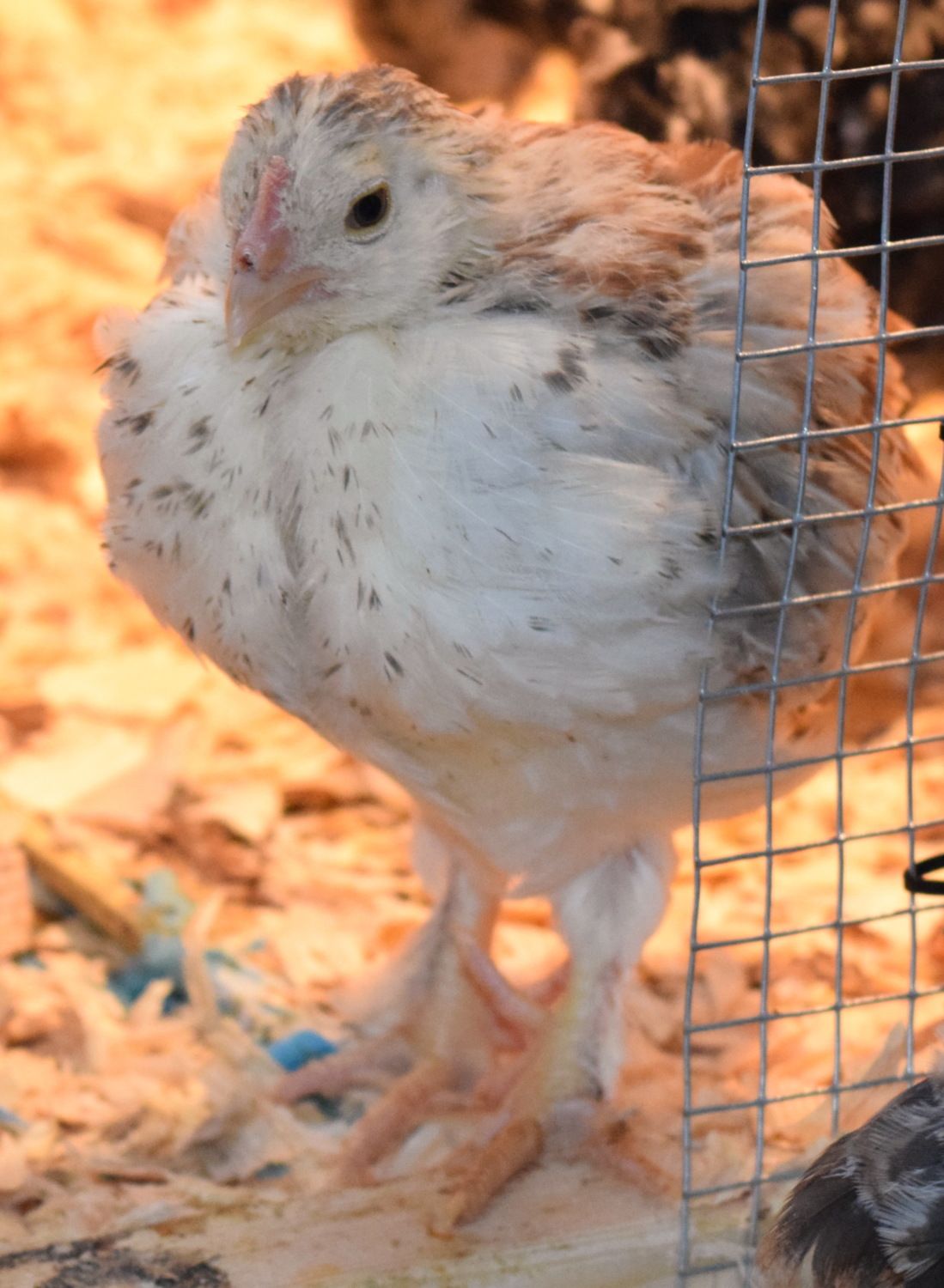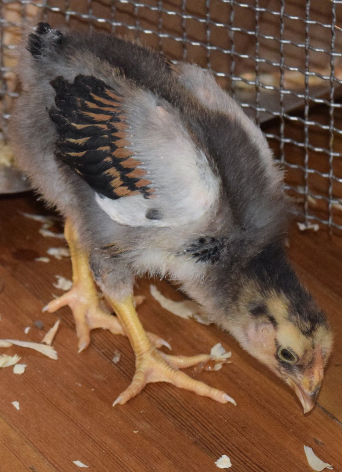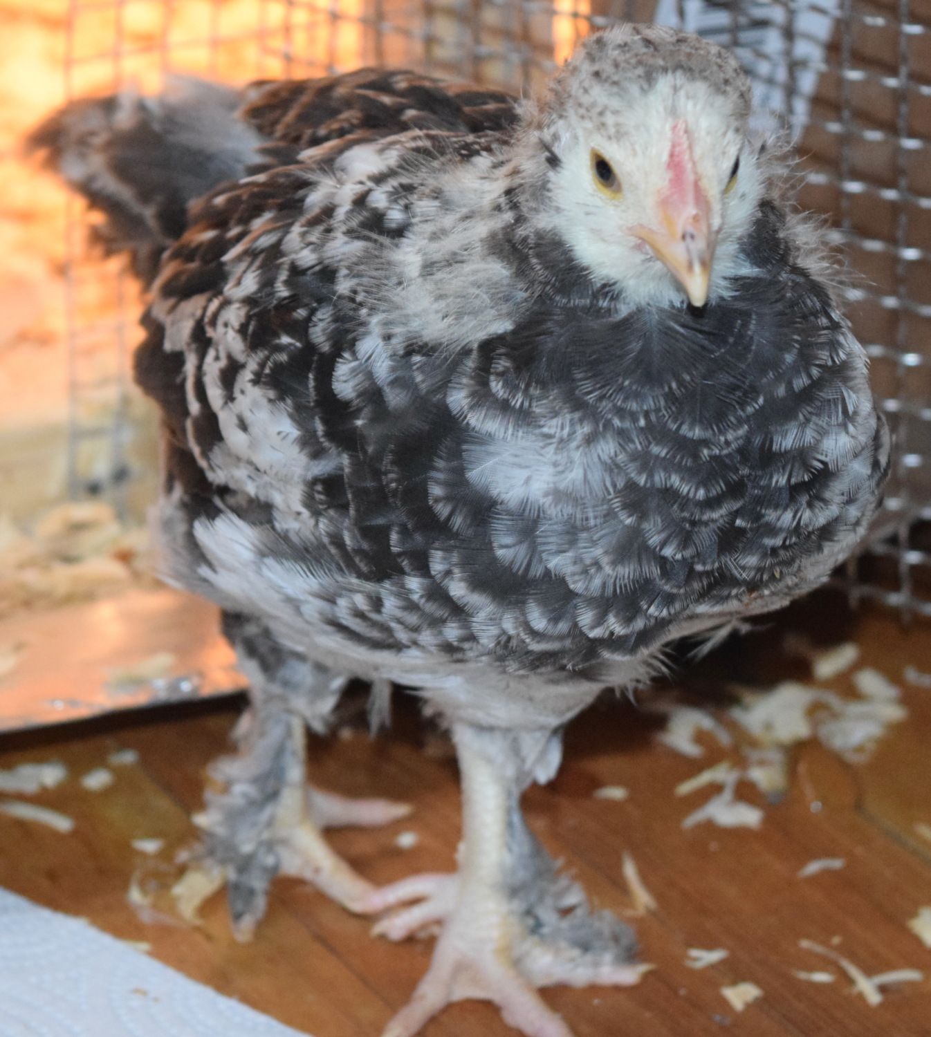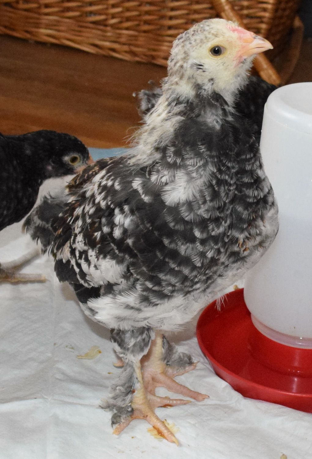 The friendliest and least flighty Salmon Faverolle... fingers are crossed still that it's a female, poor color hatchery chick... although could be a rooster.
