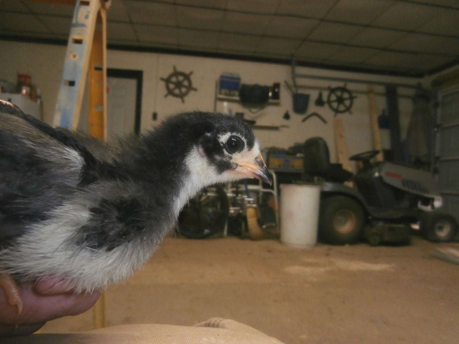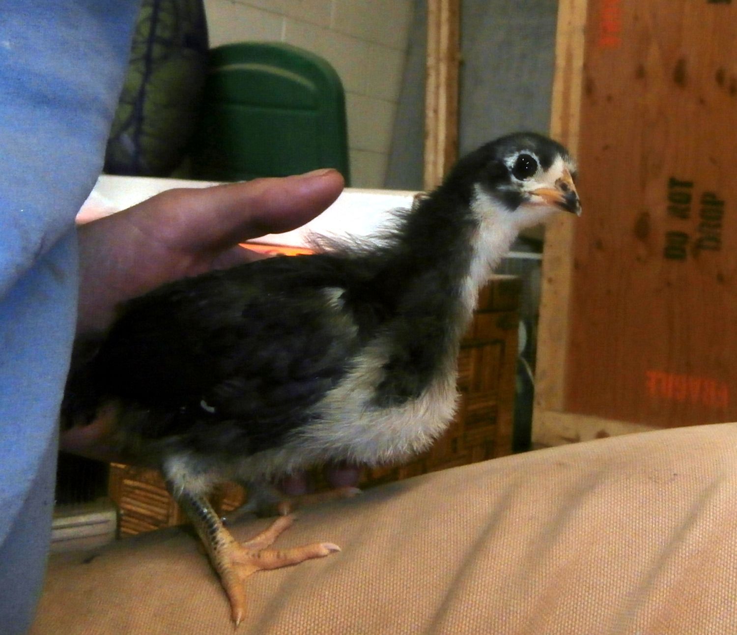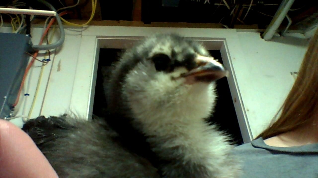 She looks a lot like my black girl, but about the same size with less feather development. It's hard to tell with the black markings on her face if she has a beard or not. If you post some frontal pics, it might be easier to tell. Even some looking down on her head. That might be the best. I included some pictures of two of my girls at 1 wk 3 dys for comparison. Also, where did you get her, and how old is she? From what I see here, if she is a ameraucana, then she has a very small beard for the size she is. In comparison to my 3 girls, I would peg her at about a week, maybe a little under. I also can't see her wings very well, since the focus was on her neck, but that is my estimation of her age.
