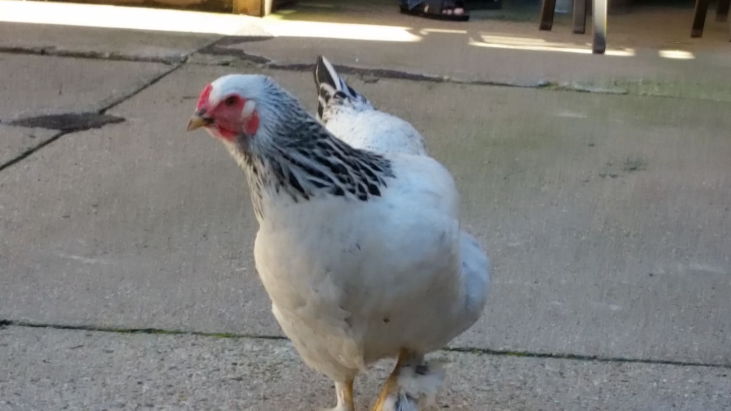 Some pictures of my 23 weeks old Light Brahma Cutie. How bad are the black feathers on her back? She is almost 6 lbs already so I have a feeling she will mature to be a big girl.