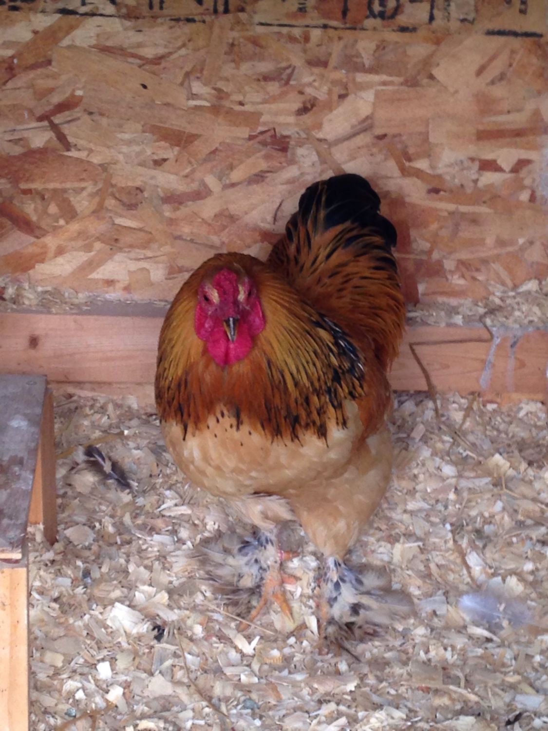 My Light Brahma is a bumbling teenager and though he is not mean and is understandably learning the ropes, he uses the top of one of the BO's heads as a handle and has given her a big awful bruise on her head and taken all her feathers off the top of her head trying to balance himself since he is huge and she is regular size.I just see so many poor little hens with naked backs from the roosters. I don't want that to happen to my little girls. Hopefully he'll be a perfect gentleman in every way.![]()