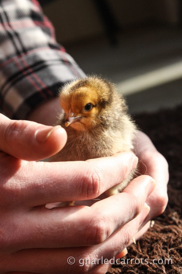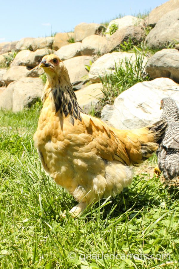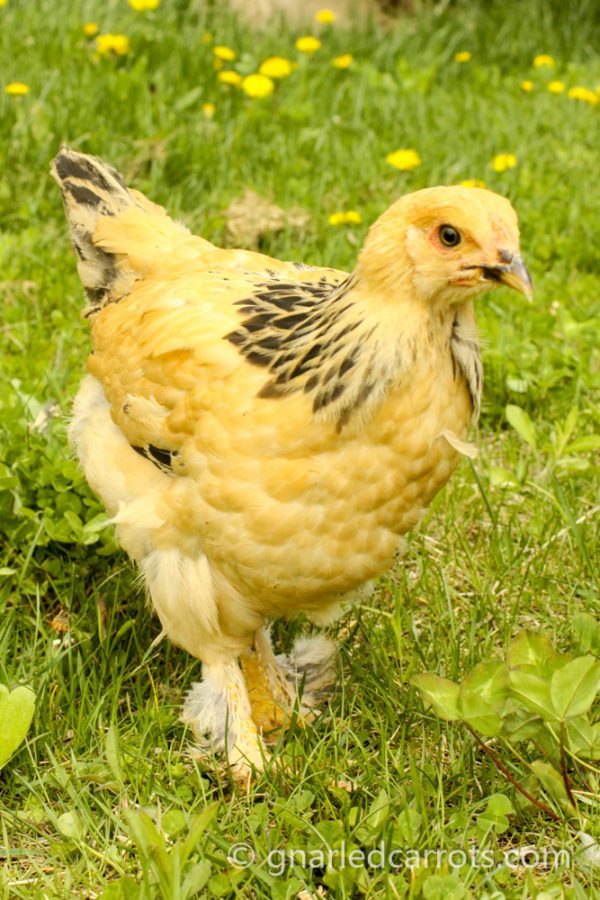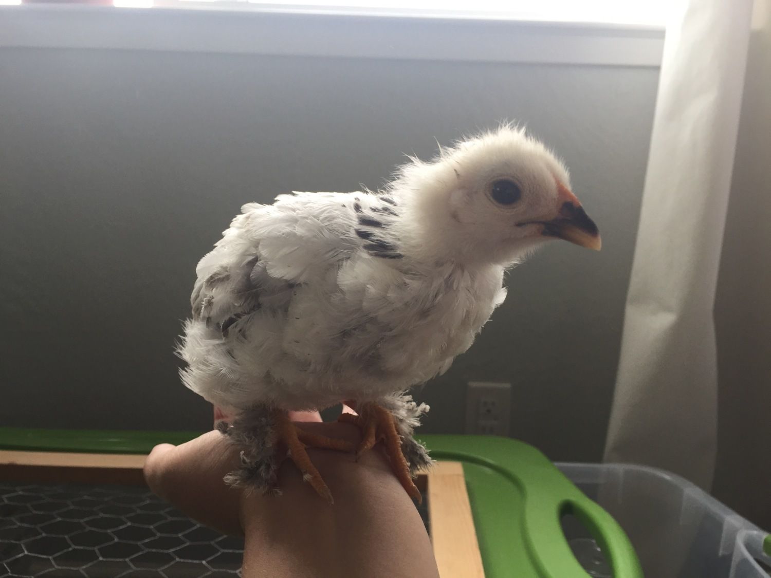Blanche at 4 weeks old. Her black feathering around her neck is coming in more pronounced now. My daughters call it her "necklace". She is just the most friendly girl. She is the first to come to me, and she wants to be picked up and held. She also enjoys pecking my painted toenails, but I keep telling her they aren't treats, but alas, she is persistent. Hehe.