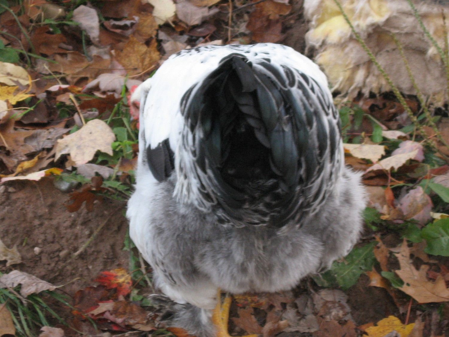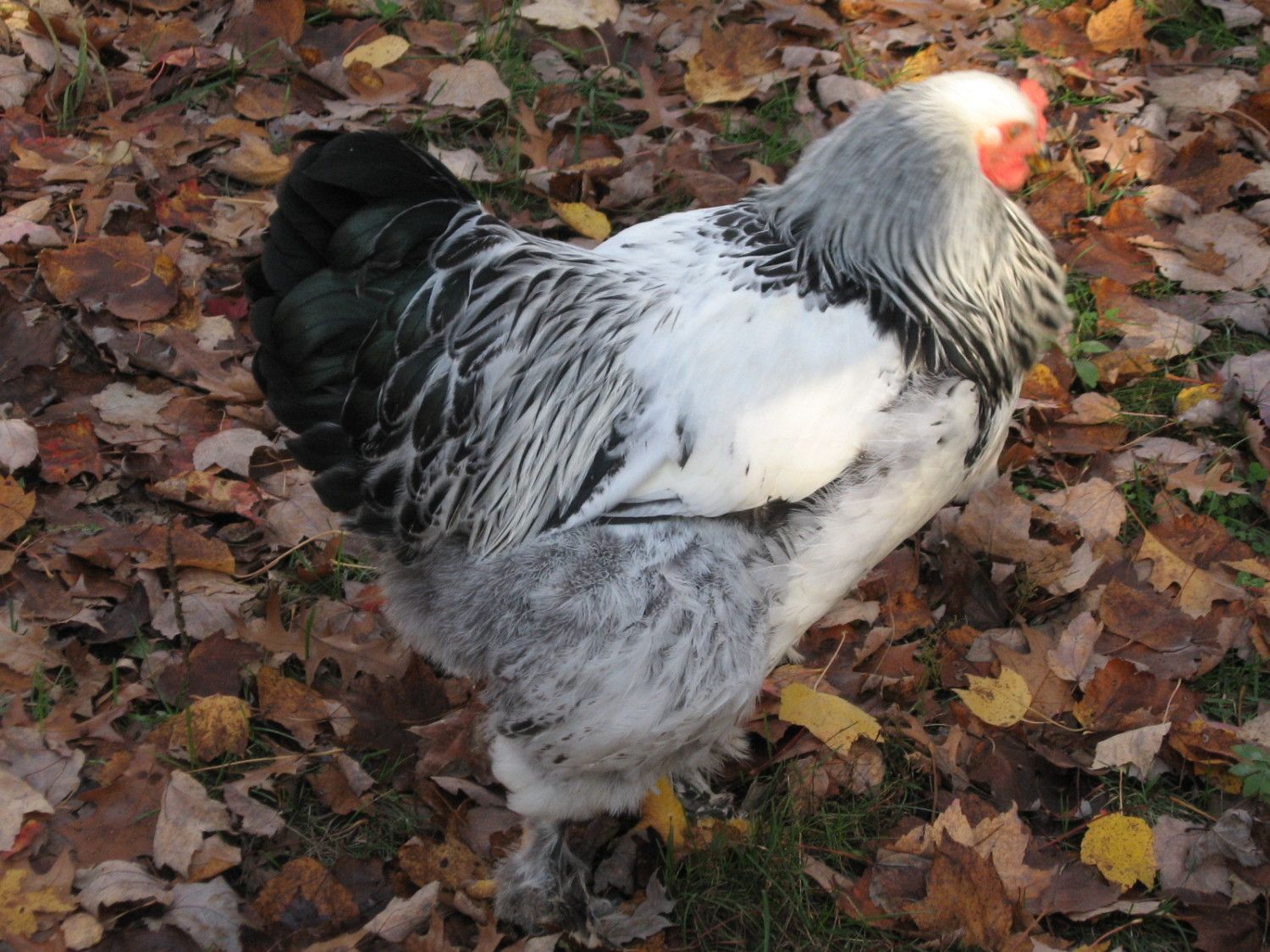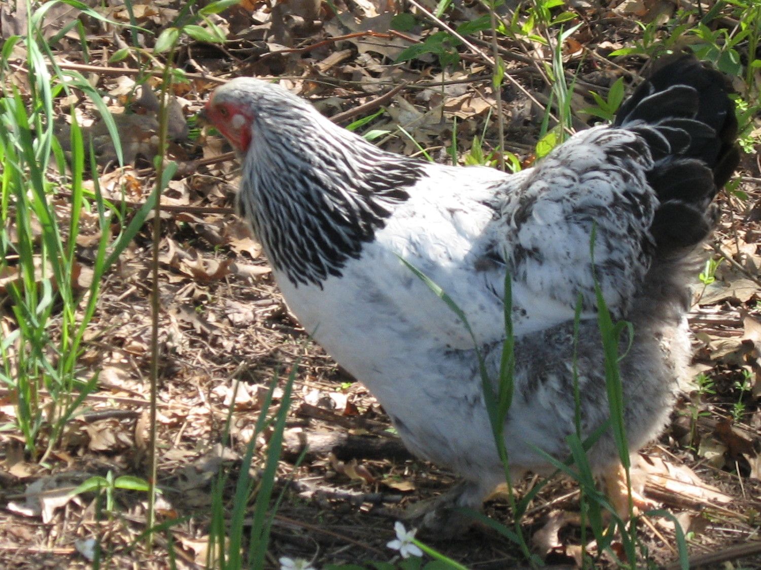 This is a hatchery Light hen. She has just about every flaw there is...small/narrow head, small body size, narrow/short body, tail angle too high and tail pinched.