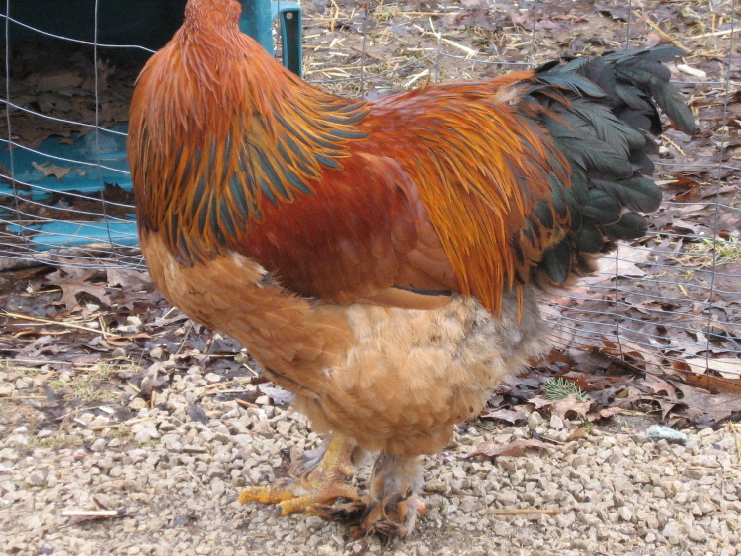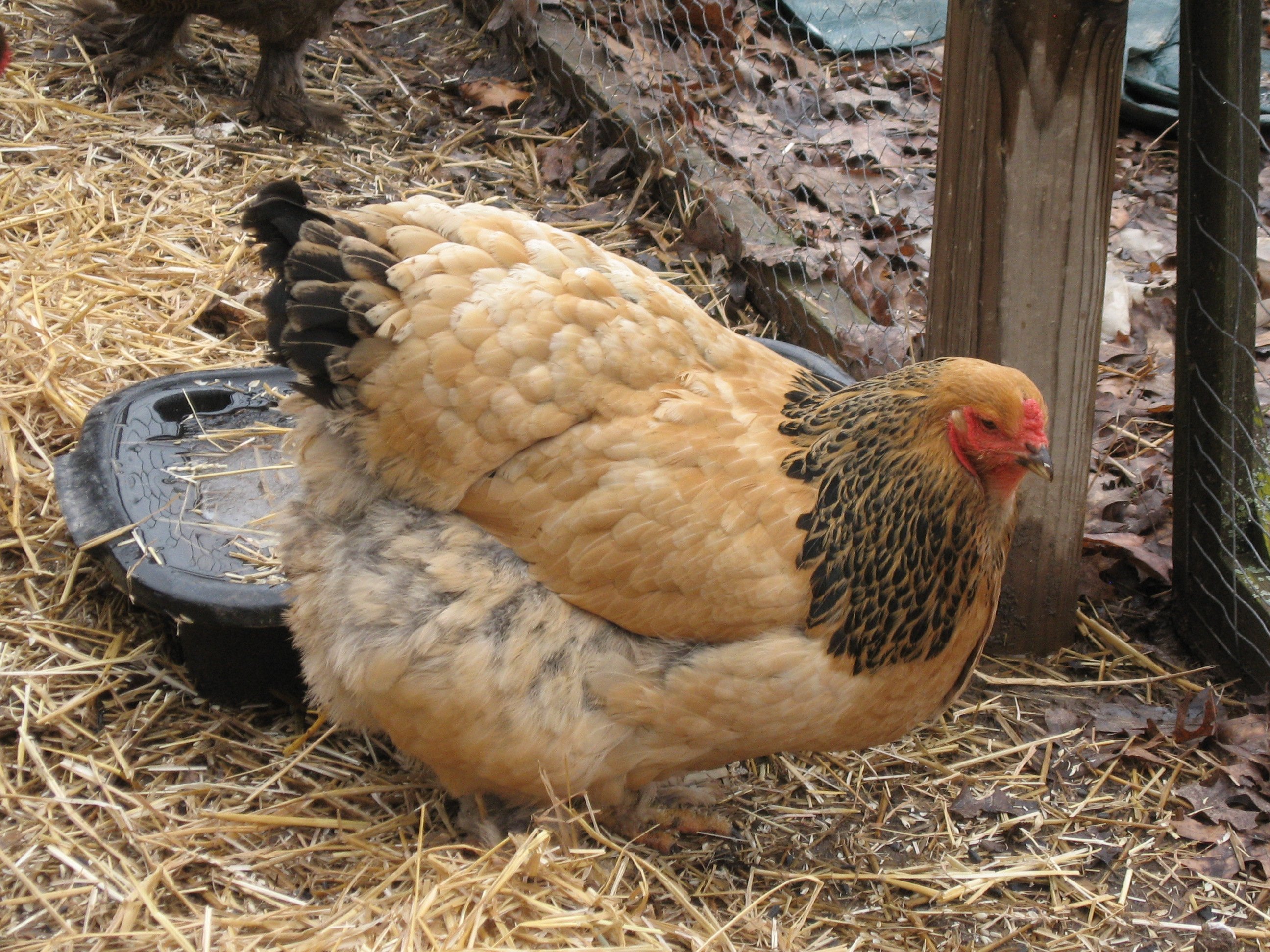 This is a show bred Buff hen. She is winter worn/faded and is molting so her tail doesn't look good right now but she has a long/wide body, better tail angle, proper horseshoe shaped tail, and a wide head (her body is so large it makes her head look small but it really isn't). She has some color issues and her comb is too big but if she were in good feather and conditioned I wouldn't hesitate to show her.