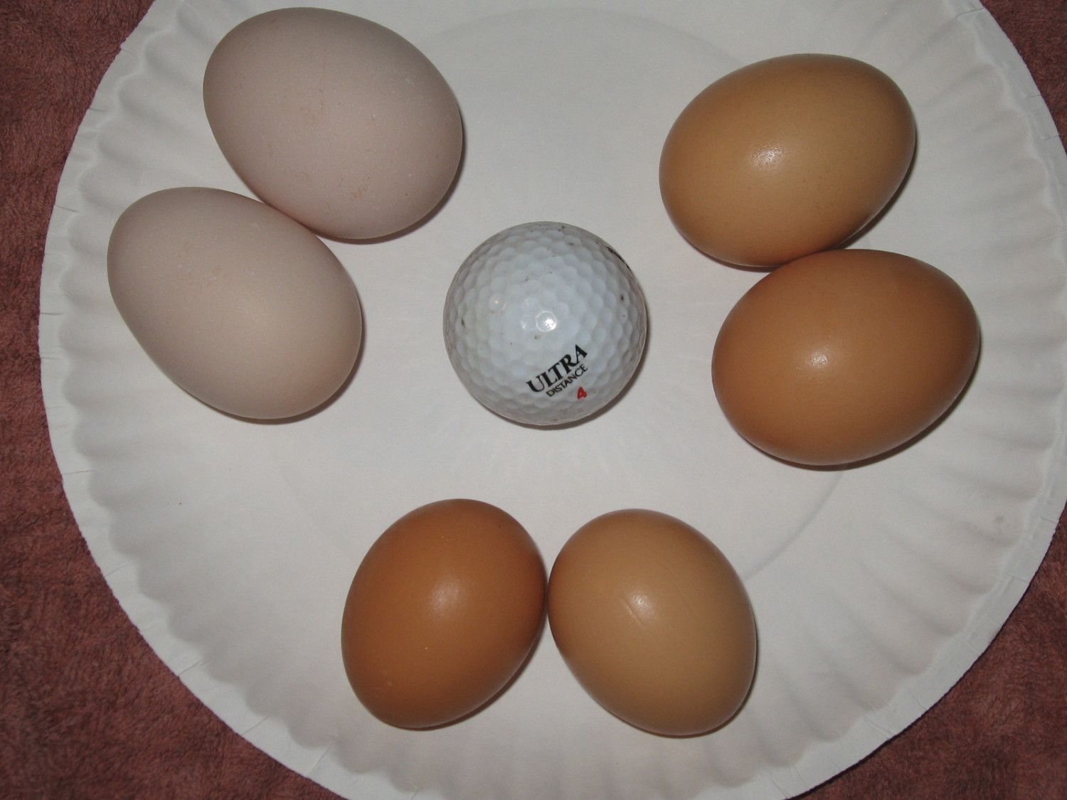 Someone over there did post a pic of a golf ball with the bantam eggs, so now all you need is a pic of LF. eggs with a golf ball. I'd help you out but mine aren't laying yet.