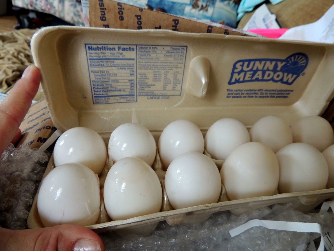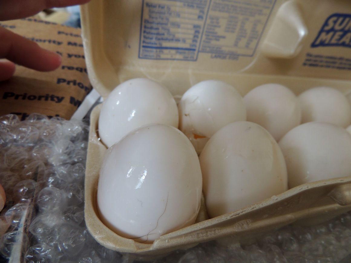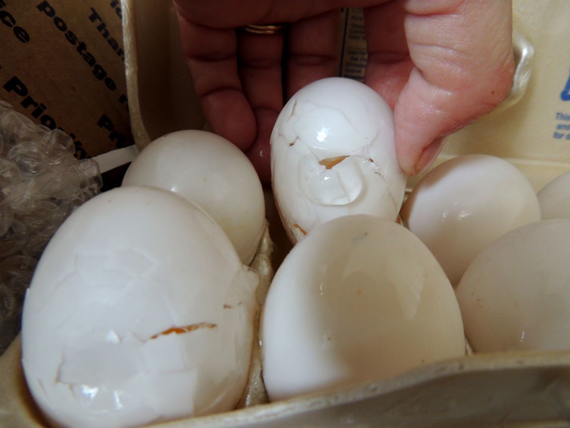 I got 10+ Pekin Duck eggs today that were shipped to me from en eBay seller on Monday. This is how they arrived (VERY poorly packaged and several smashed, egg whites all over the place). This person did a lousy packing job. I told her she needs to make it right BEFORE I leave her (bad) feedback. She has not responded back to me. This is totally unacceptable. I would NEVER ship eggs packed like that (12 eggs crammed into a small egg carton w/NO padding between each egg)! HORRIBLE.